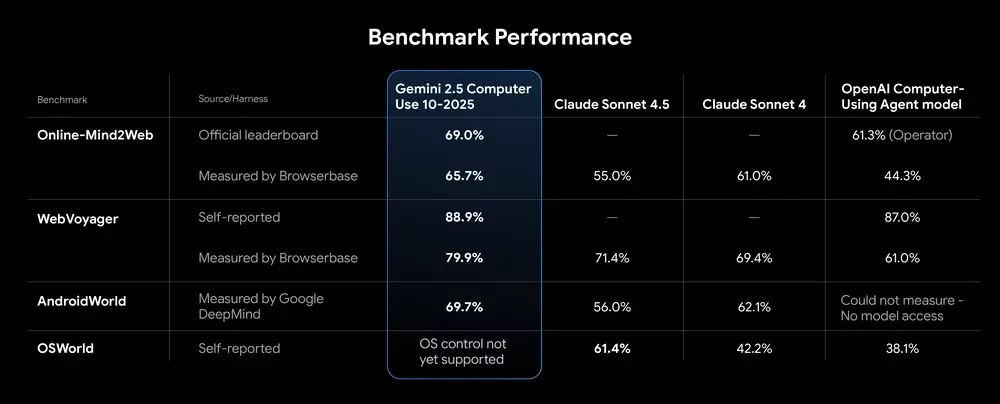 Gemini 2.5 Computer Use оптимизирована для работы с браузерами, но уже показывает хорошие результаты при управлении мобильными интерфейсами. При этом поддержка настольных операционных систем пока не реализована. Модель демонстрирует высокую производительность в нескольких контрольных тестах и превосходит конкурентов по нескольким показателям. Google внедрила функции безопасности непосредственно в модель, чтобы устранить основные риски, а также предоставляет разработчикам средства контроля безопасности, позволяющие предотвратить автоматическое выполнение моделью потенциально опасных или вредоносных действий.
