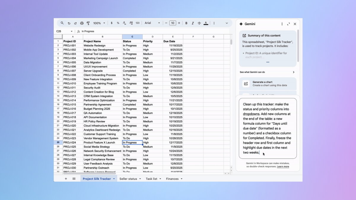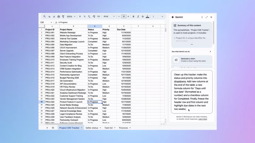 Например, Gemini можно попросить полностью переформатировать простой трекер проектов за одну команду — достаточно попросить ИИ добавить раскрывающиеся списки «Статуса» и «Приоритета», вставить новый столбец с формулой расчёта «Дней до даты выполнения», добавить столбец с флажками «Завершено» и закрепить строку заголовка для удобства просмотра. По словам компании Google, система распознает столь сложный многошаговый запрос и выполнит все поставленные задачи. И, собственно, на GIF-изображении ниже компания наглядно продемонстрировала процесс обработки запроса — сначала ИИ анализирует задачу, а затем выполняет действия и указывает каждый проделанный шаг в окне ввода команды.