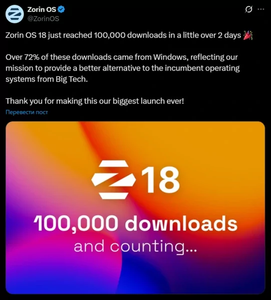 В социальной сети X компания-разработчик заявила, что всего за два дня дистрибутив Zorin OS 18 скачали более 100 000 раз. Создатели дистрибутива сообщили, что это «самый крупный запуск в истории», а 72% загрузок пришлось на пользователей Windows.