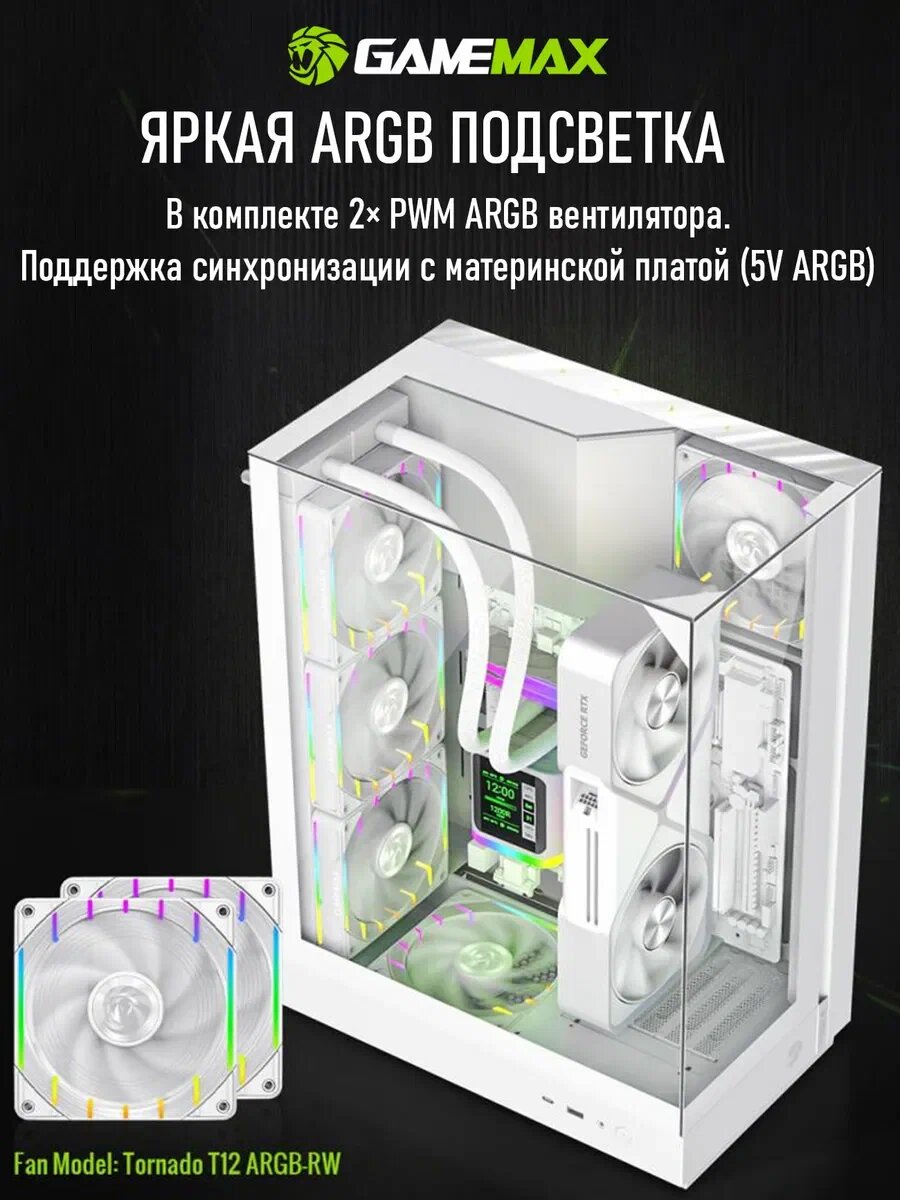 Дело в том, что в данном корпусе материнская плата размещается под углом 90°, что положительно сказывается на эффективности активных систем охлаждения. Более того, корпус оборудовали пятью посадочными местами под вентиляторы с диаметром лопастей 120 мм, также можно поставить радиатор жидкостной системы охлаждения на три секции (то есть до 360 мм) на заднюю стенку. Да и сам корпус из коробки поставляется с двумя предустановленными PWM-вентиляторами Tornado T12-R по 120 мм с ARGB-подсветкой, то есть пользователю не придётся докупать вентиляторы отдельно. Это важное преимущество, особенно если есть желание создать внутри системы мощный воздушный поток.