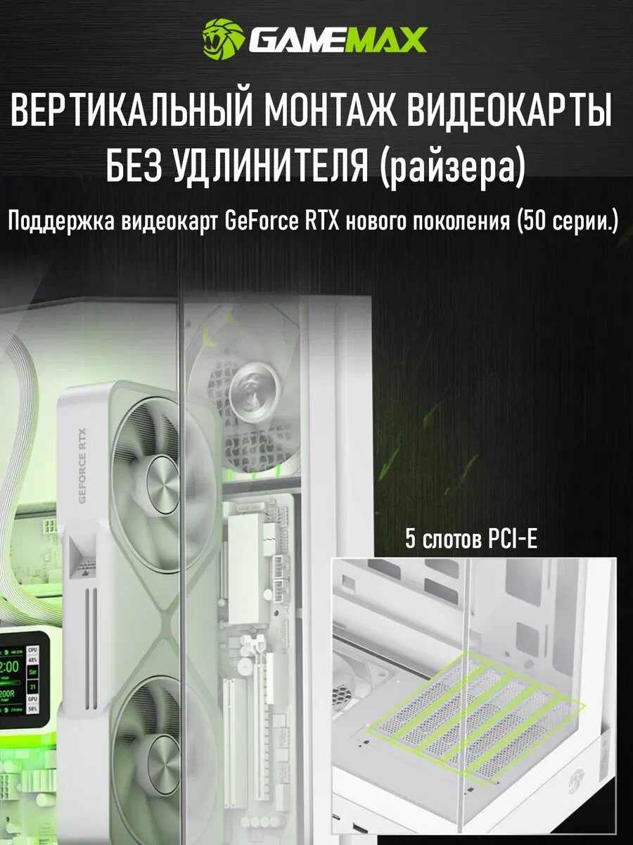 И так как материнская плата установлена под углом 90°, инженерам GAMEMAX удалось решить одну из ключевых проблем современных сборок. Суть в том, что обычно видеокарта в корпусе «смотрит» вниз из-за горизонтального расположения, так что рассмотреть декоративный кожух (самый красивый элемент графического ускорителя) не представляется возможным. Но в данном случае вентиляторы видеокарты, расположенной вертикально, будут направлены на фронтальную панель корпуса, позволяя рассмотреть важнейший компонент ПК во всей красе. Примечательно, что подобные решения на рынке встречаются невероятно редко, если встречаются вообще.