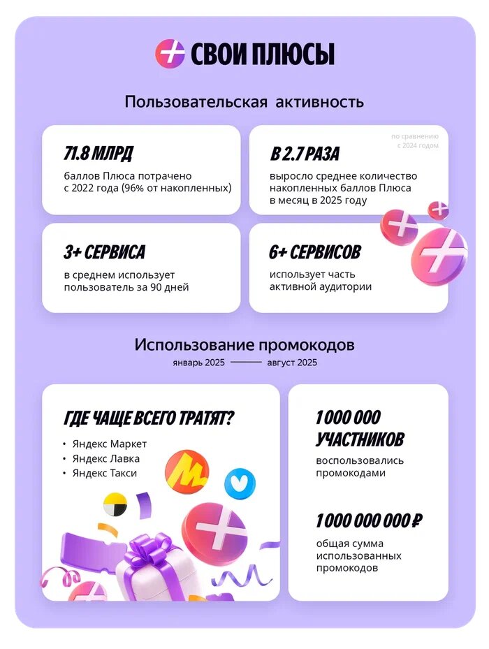 Новая программа помогает ближе познакомиться с сервисами Яндекса и партнёров, позволяет вовлекать аудиторию и повышать её лояльность. Присоединиться к «Своим Плюсам» можно на сайте или через значок баллов Плюса в сервисах экосистемы.