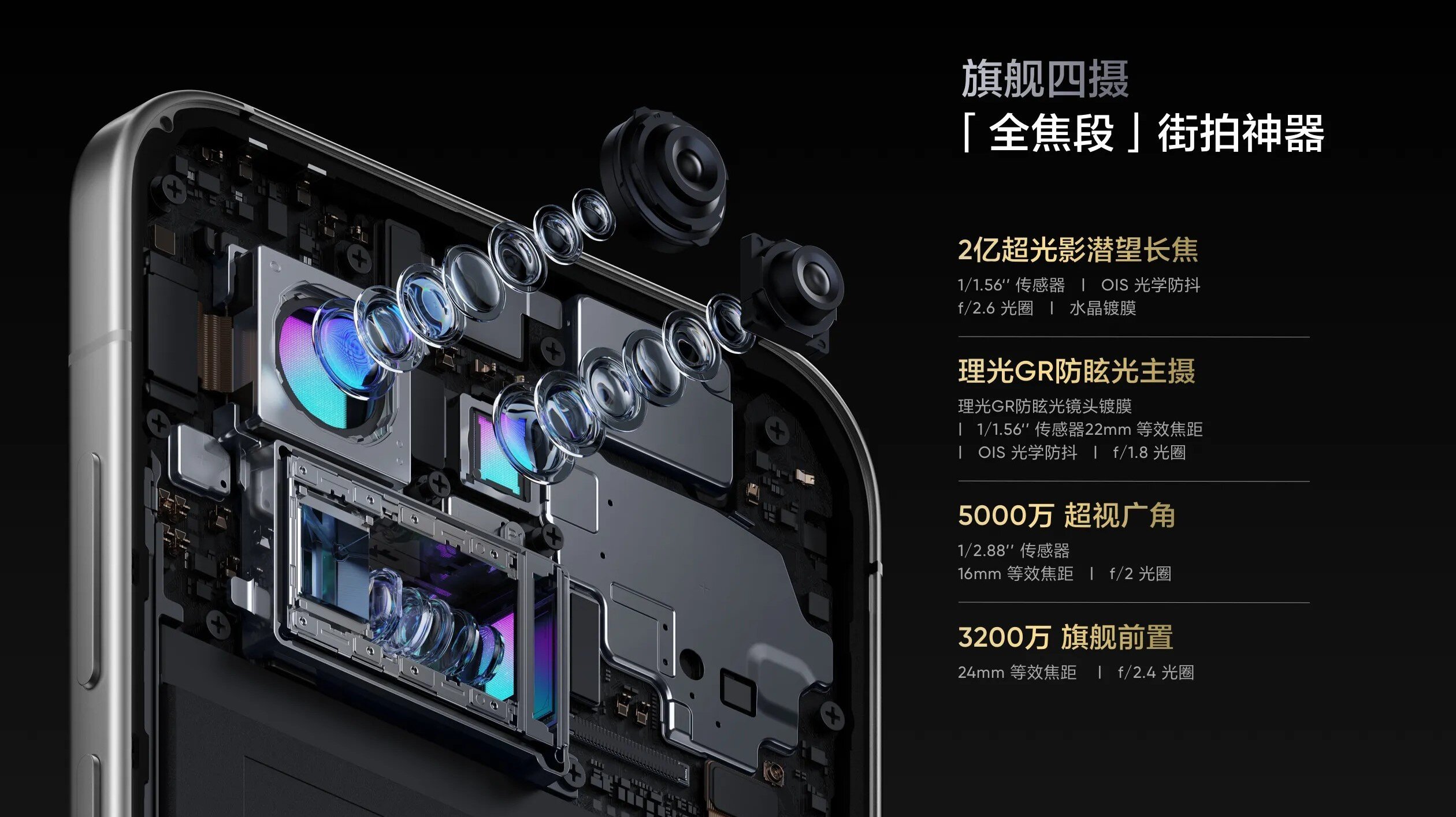 GT8 Pro стал первым смартфоном бренда с настройками и алгоритмами обработки изображений от Ricoh, что знаменует начало сотрудничества с легендарной японской компанией. Смартфон также совместим с полнокадровыми фокусными расстояниями Ricoh GR 28 мм и 40 мм, а пользователи получают доступ к пяти фирменным режимам съёмки. Главный модуль с перископическим объективом имеет разрешение 200 Мп, 3-кратный оптический зум и 12-кратный зум без потери качества. Используется сенсор 1/1,56 дюйма (ISOCELL HP5) с диафрагмой f/2,6 и двухосевой оптической стабилизацией изображения.