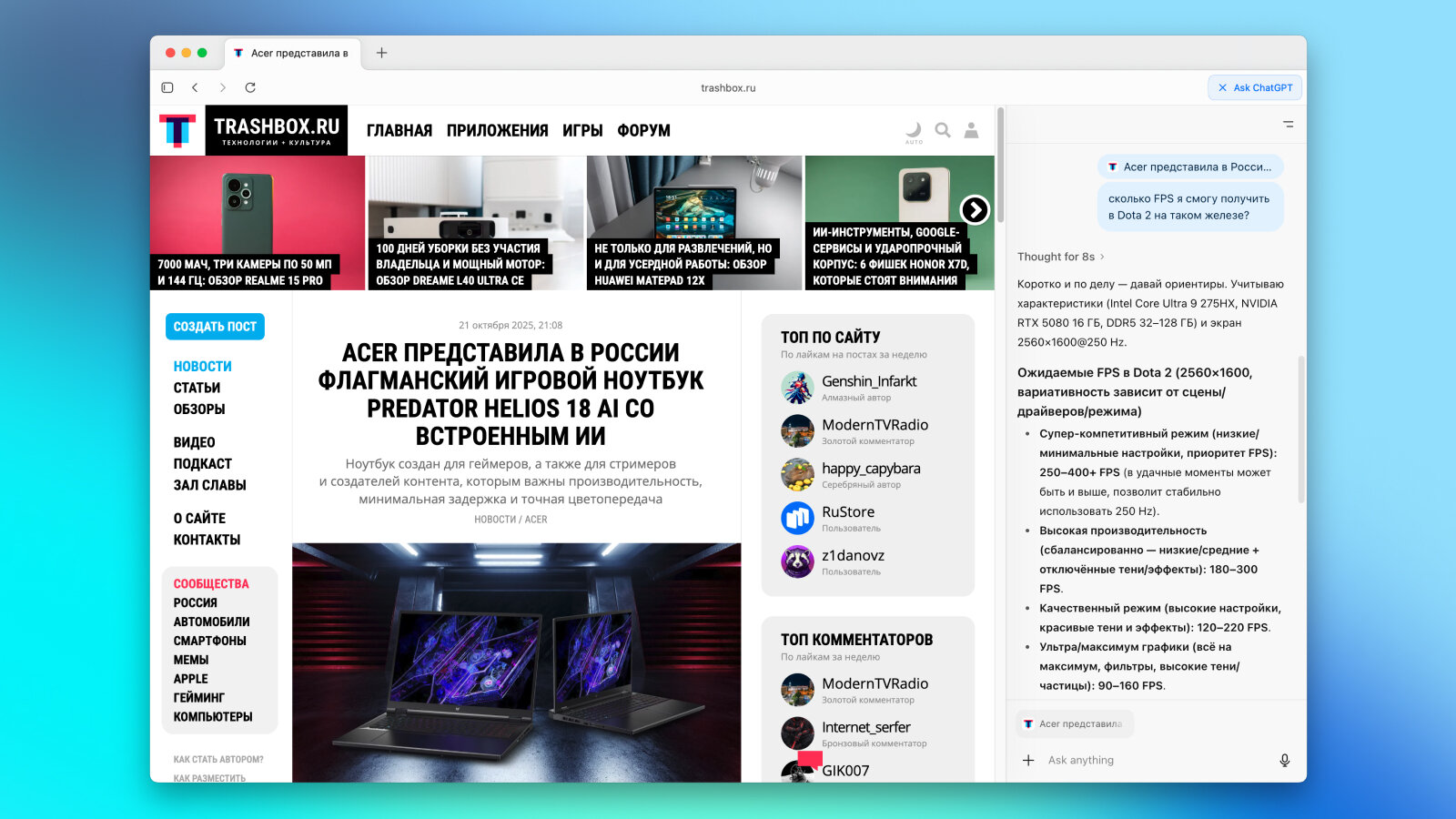 Примечательно, что если бота запустить при открытой веб-странице, он будет понимать её контекст и сможет отвечать на поставленные вопросы, составлять краткий пересказ информации или анализировать полученные данные для более сложных задач. Например, можно открыть новость о релизе нового ноутбука в России и спросить, сколько FPS на нём можно будет получить в Dota 2: