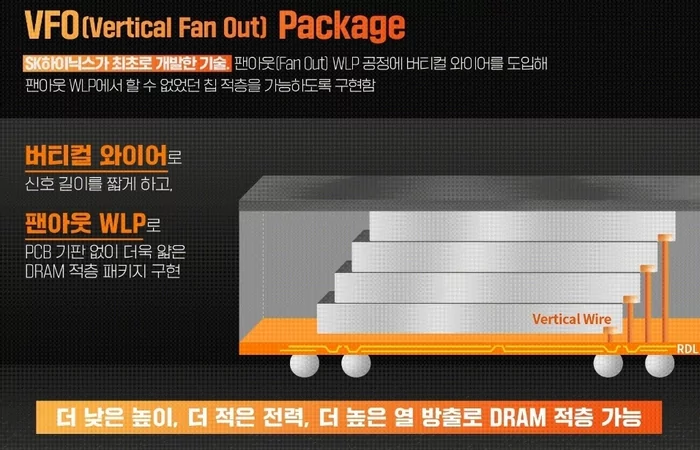 Исходя из предоставленной ETNews информации, новейшая разработка предоставляет производителю возможность объединить до 16 элементов DRAM и NAND, «связывая» каждый из модулей памяти посредством технологии вертикального разветвления (Vertical Fan Out или VFO) для повышения скорости обмена данными. Стоит напомнить, что впервые технологию упаковки VFO компания представила ещё в 2023 году — её преимущество в соединении модулей памяти по прямой линии вместо традиционного изогнутого соединения, что сокращает расстояние между контактами, снижая потери и задержки при передаче сигнала.