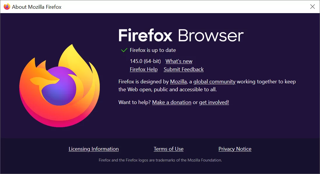 Обновление Firefox 145.0 должно быть установлено автоматически. Пользователи настольных компьютеров могут ускорить установку, выбрав «Меню» > «Справка» > «О Firefox».