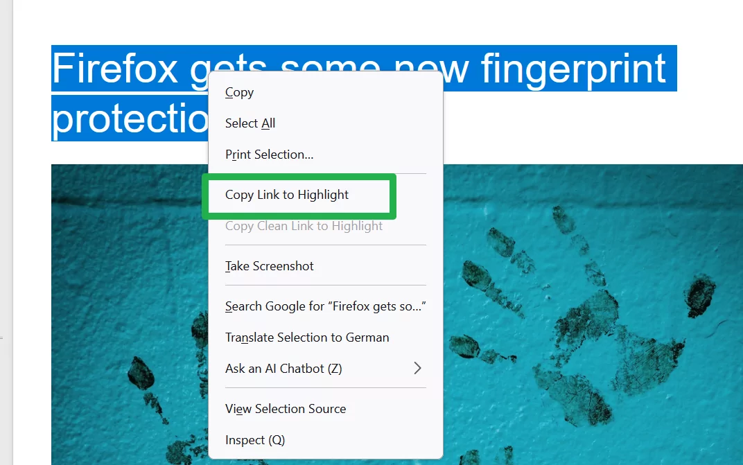- Появилась поддержка ссылок на определённые разделы сайта. Можно выделить любой фрагмент сайта, кликнуть правой кнопкой мыши по выделенному фрагменту и выбрать пункт «Копировать ссылку в выделенный фрагмент» (Copy Link to Highlight).