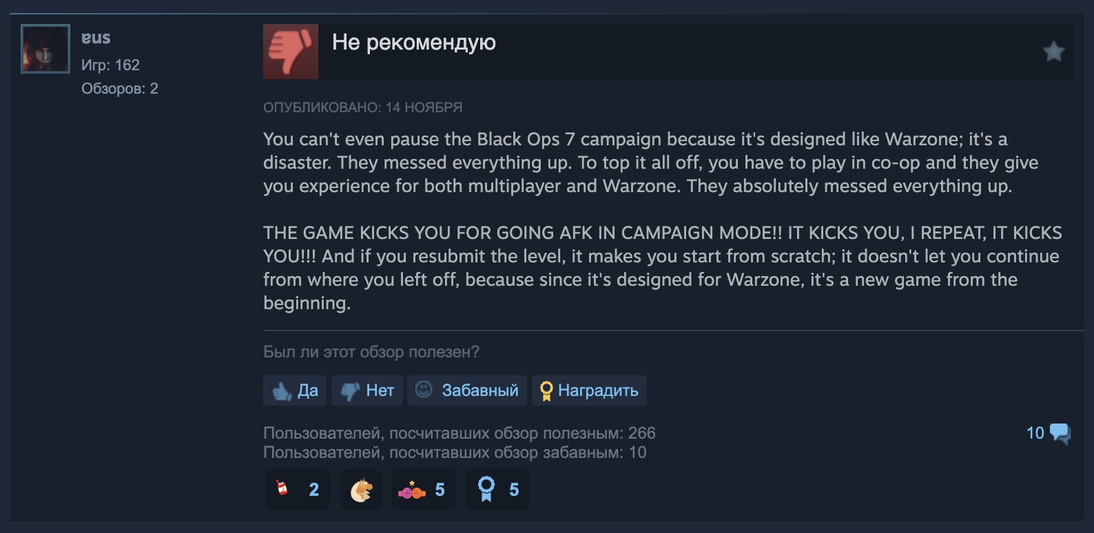 «Вы даже не можете поставить кампанию Black Ops 7 на паузу, потому что она разработана, как Warzone. Это катастрофа. Они всё испортили», — написал пользователь с ником ɐus.