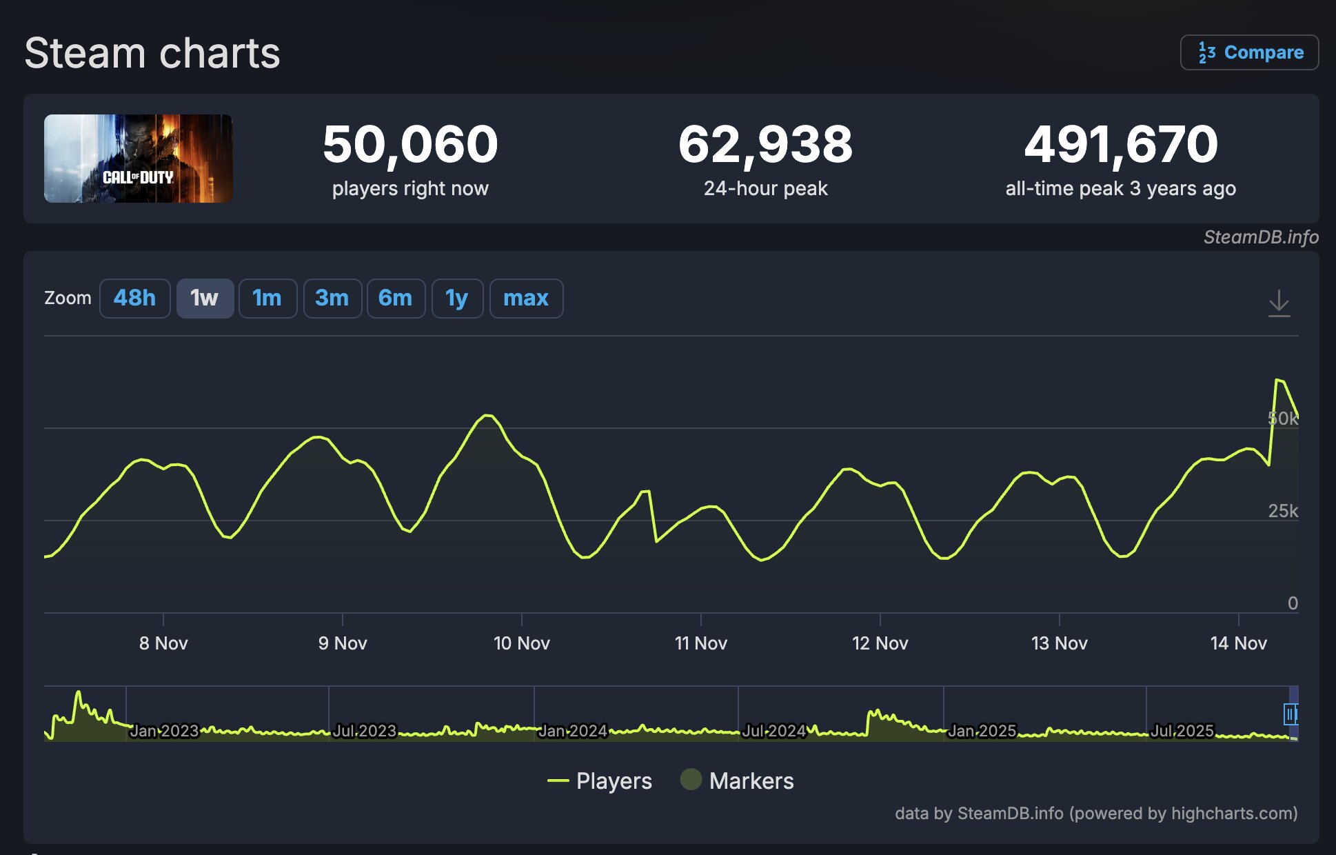 Сегодня, 14 ноября, состоялся релиз долгожданного шутера Call of Duty: Black Ops 7, который, очевидно, прошёл для Activision не так гладко, как ожидал издатель. Во-первых, запуск новой части культовой франшизы практически не сказался на онлайне серии (в статистике учитывается онлайн не только Black Ops 7, но и бесплатной Warzone) в Steam — если вчера, 13 ноября, в пике тайтл набирал около 38 тысяч активных игроков, то сегодня статистика SteamDB отображает 51 тысячу пользователей. То есть запуск Black Ops 7 увеличил текущий онлайн серии всего на 10-12 тысяч одновременных игроков, что, конечно, очень скромно по современным меркам.