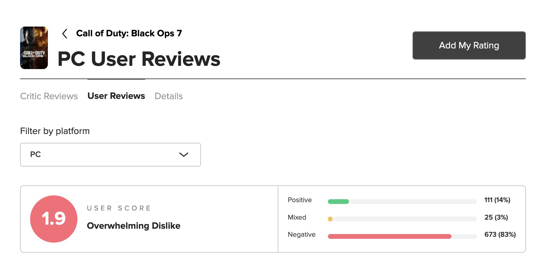 На данный момент на основе 809 обзоров пользовательская оценка Call of Duty: Black Ops 7 на Metacritic составляет всего 1,9 балла из 10 возможных — это худший результат за всю историю существования франшизы Call of Duty. Новинке удалось «обойти» даже Modern Warfare 3, которая в 2023 году вышла на ошеломительной волне негатива со стороны сообщества (тогда новую часть шутера называли «DLC за фуллпрайс»), при этом фанаты отмечают явную схожесть между частями.