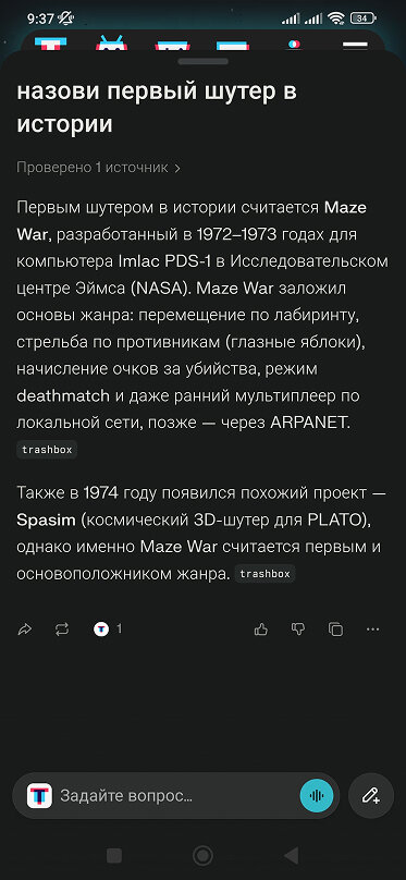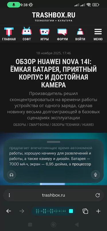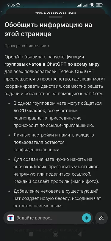 Отдельно стоит выделить функцию голосового взаимодействия с ИИ-помощником — в окне ввода запроса в правой части экрана имеется характерная бирюзовая кнопка, нажав на которую, пользователь получает возможность диктовать команды искусственному интеллекту. Кроме того, когда команда будет получена и проанализирована, ИИ начнёт синхронно отображать текстовый ответ на запрос и проговаривать эту же информацию вслух. Фишка очень удобная — можно на ходу получать краткий пересказ информации и ответы на сложные вопросы, прослушивая их в наушниках или на динамиках. Правда, автор новости заметил странный баг — уменьшение/повышение громкости смартфона никак не сказывается на громкости диктора в браузере.