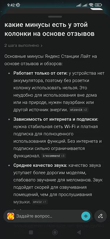 Также ИИ-приложение очень хорошо справляется с анализом преимуществ и недостатков различных товаров в интернете — достаточно открыть страницу с умной колонкой, а затем попросить составить резюме по отзывам на данную модель в интернете. После этого браузер прошерстит сеть в поисках отзывов, обзоров и даже видео, а затем выдаст список ключевых моментов, на которые пользователи обращали своё внимание. Более того, при желании можно сравнивать товары между собой, что тоже экономит немало времени.