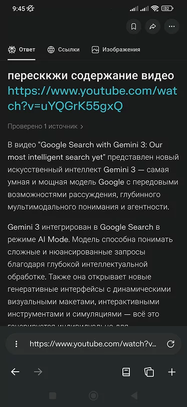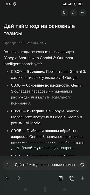 Ещё Comet может анализировать и пересказывать видео — достаточно дать приложению ссылку и дать соответствующую команду, чтобы приложение «посмотрело» ролик и выдало краткую выжимку с основными моментами. Более того, можно затребовать тайм-коды ключевых тезисов, чтобы использовать их для факт-чекинга.