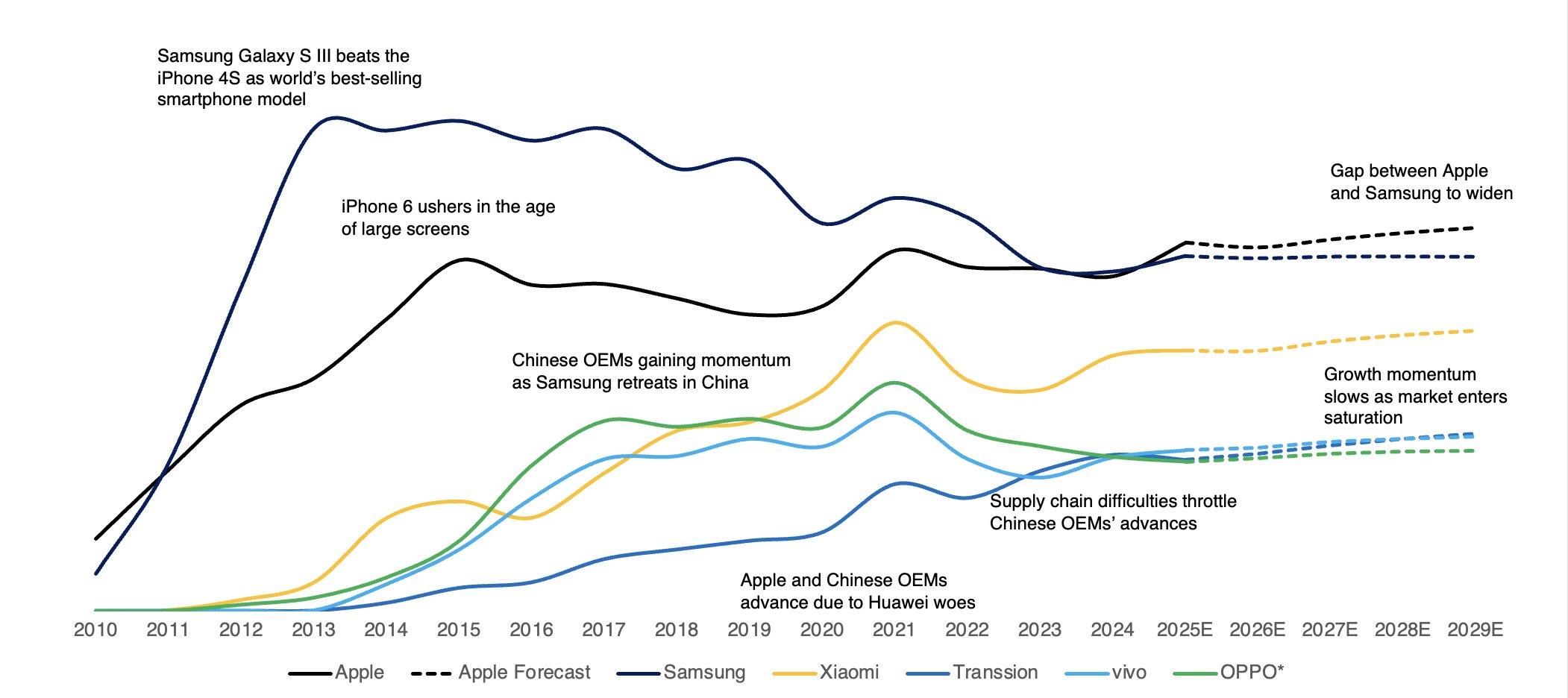 Что касается Samsung, то южнокорейской компании прогнозируют рост поставок на 5% в 2025 году, чему будет способствовать устойчивая цепочка поставок. Серия A с более мощными характеристиками и конкурентоспособными ценами ещё больше укрепит позиции Samsung на развивающихся рынках. В ключевых регионах продолжается тенденция к премиализации, что должно помочь компании сохранить долю рынка в течение следующих нескольких лет. Однако, Samsung вряд ли сможет вернуть себе лидирующие позиции до конца десятилетия, поскольку средний и нижний сегменты сталкиваются с растущей конкуренцией со стороны китайских производителей.