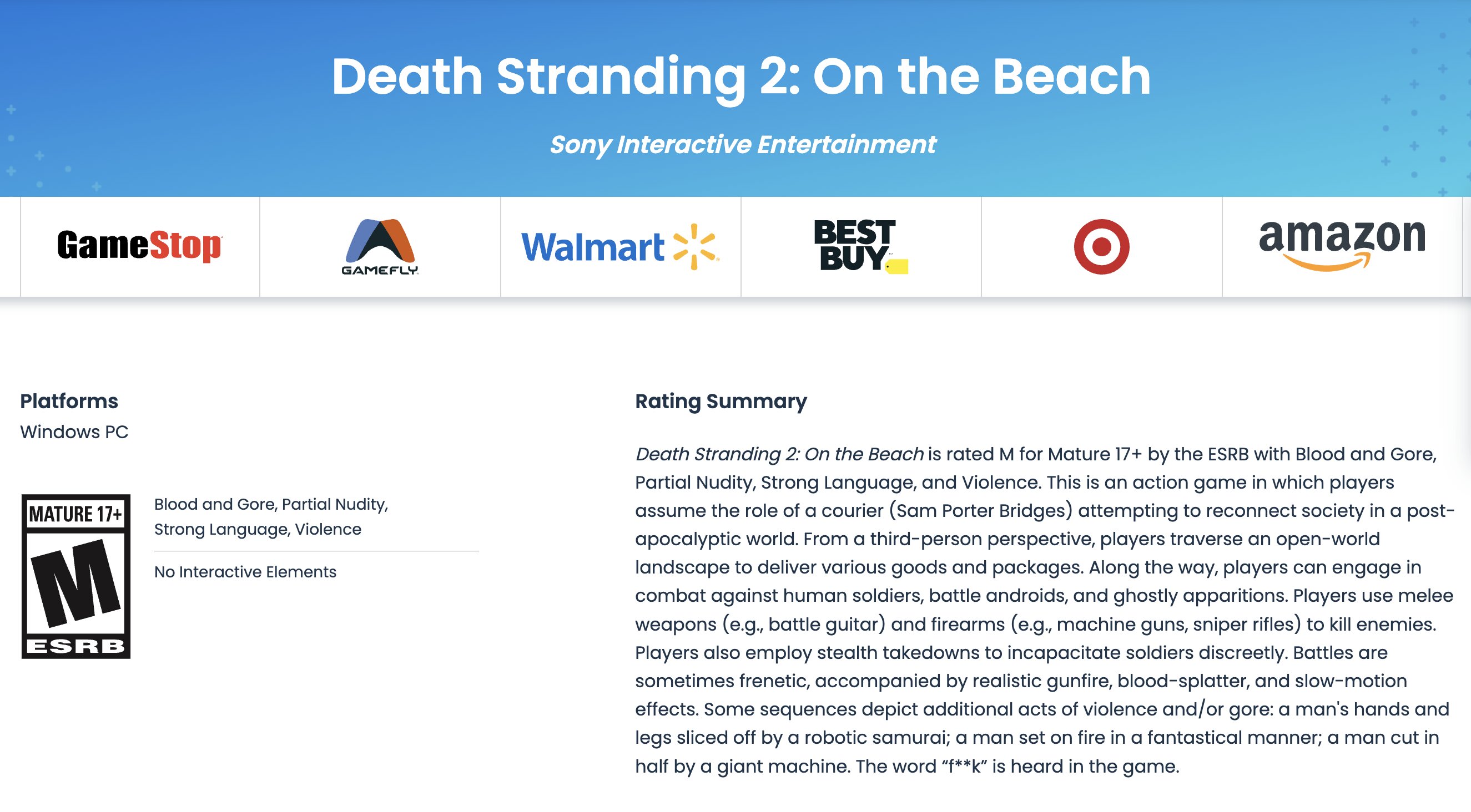 Релиз Death Stranding 2: On the Beach от студии Kojima Productions состоялся 26 июня 2025 года — эксклюзивно на платформе PlayStation 5. И так как оригинальная Death Stranding спустя какое-то время после запуска на консолях Sony была портирована на ПК, многие геймеры предположили, что спустя год-два после релиза вторую часть тоже отправят в Steam. Но, видимо, запуск на компьютерах может произойти намного раньше — информационное издание Insider Gaming со ссылкой на свои источники сообщило, что версия Death Stranding 2: On the Beach получила возрастной рейтинг ESRB для платформы Windows PC.