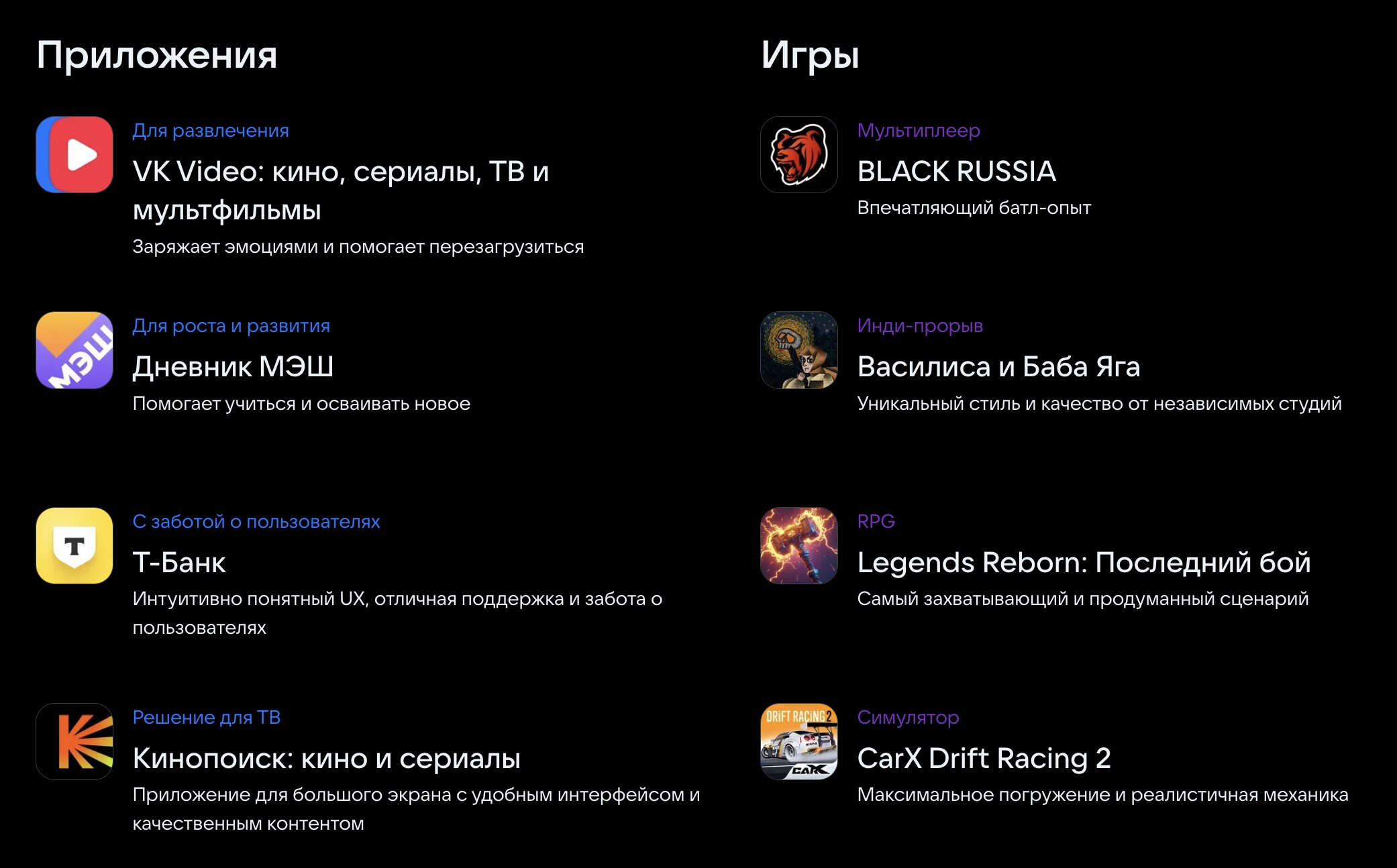 Стоит также отметить, что в категории «Игры» победу в номинации «Мультиплеер» получила крайне популярная нынче мобильная игра-симулятор реальной жизни BLACK RUSSIA, среди RPG жюри отдало предпочтение проекту «Legends Reborn: Последний бой», а в категории «Симуляторов» победу одержала фотореалистичная гонка CarX Drift Racing 2. Отдельного же внимания заслуживает приключенческая игра «Василиса и Баба Яга» с элементами хоррора, сюжет и сеттинг которой построили на базе русской народной сказки «Василиса Прекрасная», — она заняла первое место в номинации «Инди-прорыв».