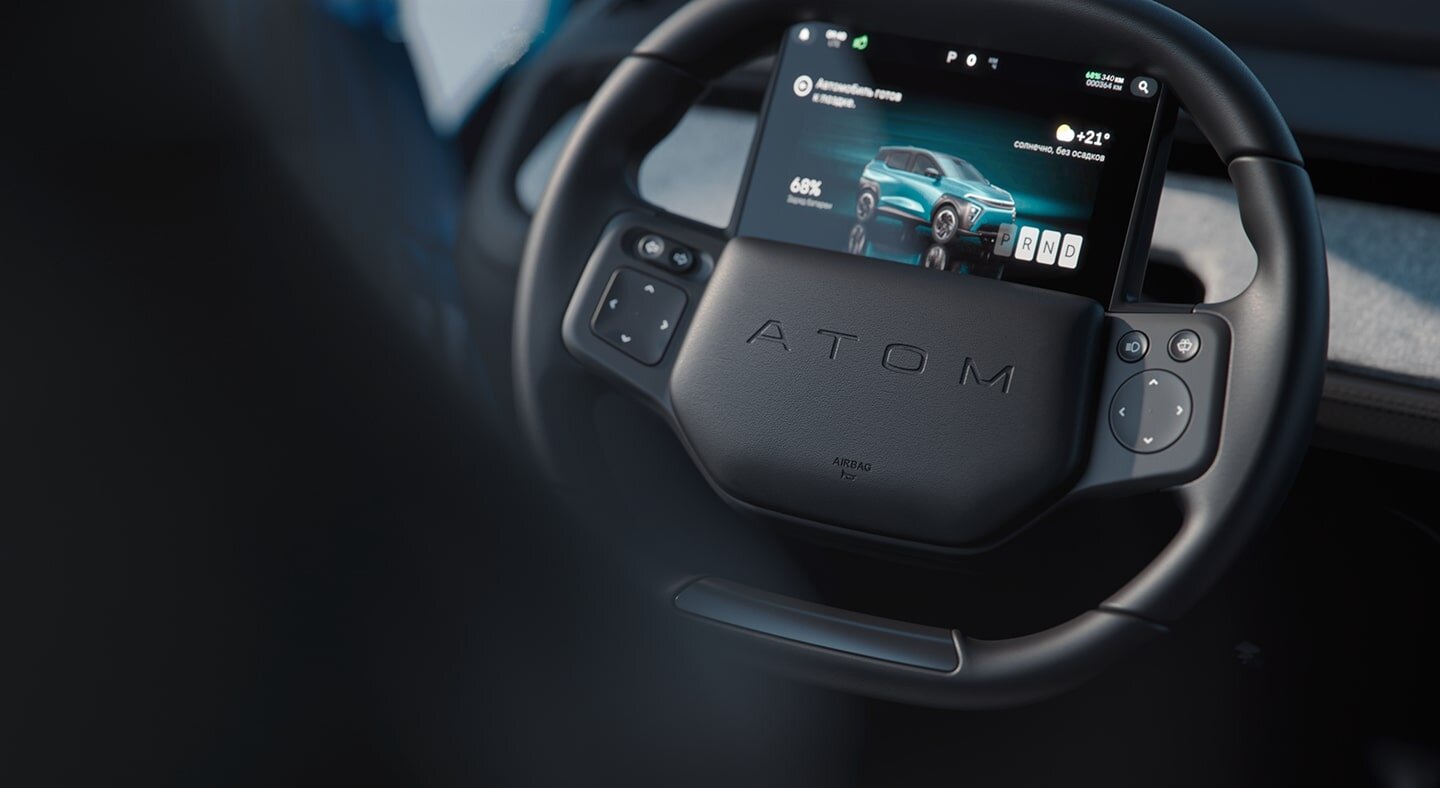 «Атом» — компактный хэтчбек, получивший задний электропривод мощностью 204 л.с. и батарею 77 кВт·ч, дающую запас хода до 500 км. Автомобиль разгоняется до 100 км/ч за 8 секунд, а его максимальная скорость достигает 170 км/ч. Производитель заявляет, что всего 8 минут зарядки должно хватить на 100 км пути. Производство модели налажено на заводе «Москвич», где уже вышел прототип серии PT (Plant Trial), который собран с использованием тех же технологий и стандартов, которые будут применяться при запуске серийной сборки.