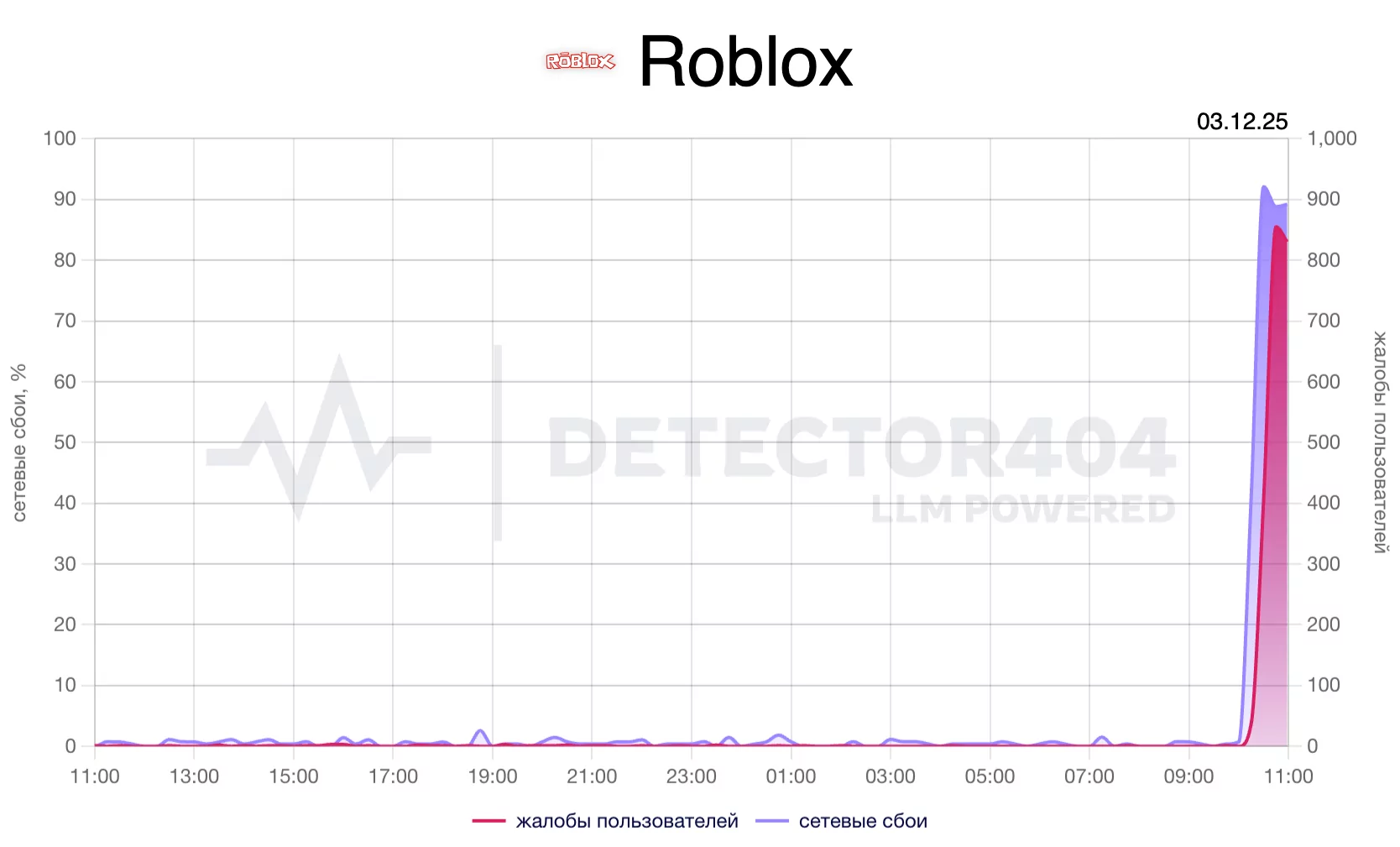 Сегодня, 3 декабря, примерно в 10 утра по московскому времени фанаты популярной детской игры Roblox из России начали массово жаловаться на проблемы с авторизацией на популярной платформе. На данный момент лишь на сервисе DownDetector зарегистрировано свыше 2 тысяч жалоб (Update: за час было зарегистрировано 2800 жалоб), хотя, судя по графику, их количество постепенно начинает снижаться.