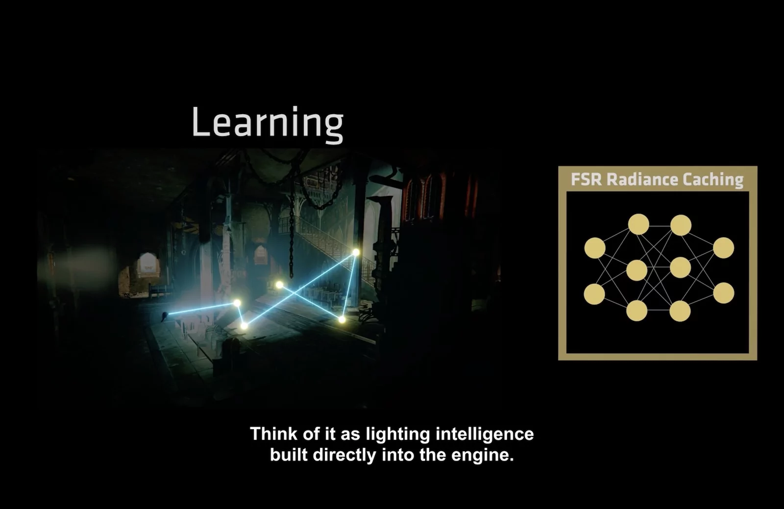 Вторым новым инструментом выступает технология FSR Radiance Caching — это метод глобального освещения, при котором рендерер вычисляет тяжёлое непрямое освещение в ограниченном наборе точек сцены, а затем повторно использует полученный результат для интерполяции ближайших пикселей или точек затенения. В AMD объяснили, что это сокращает количество лучей и отражений, которые необходимо обработать трассировкой, и это приводит к более быстрой обработке непрямого освещения, мягких отражений и цветового смешения. Правда, сработает инструмент только в том случае, если освещение не меняется слишком уж резко между закэшированными точками.