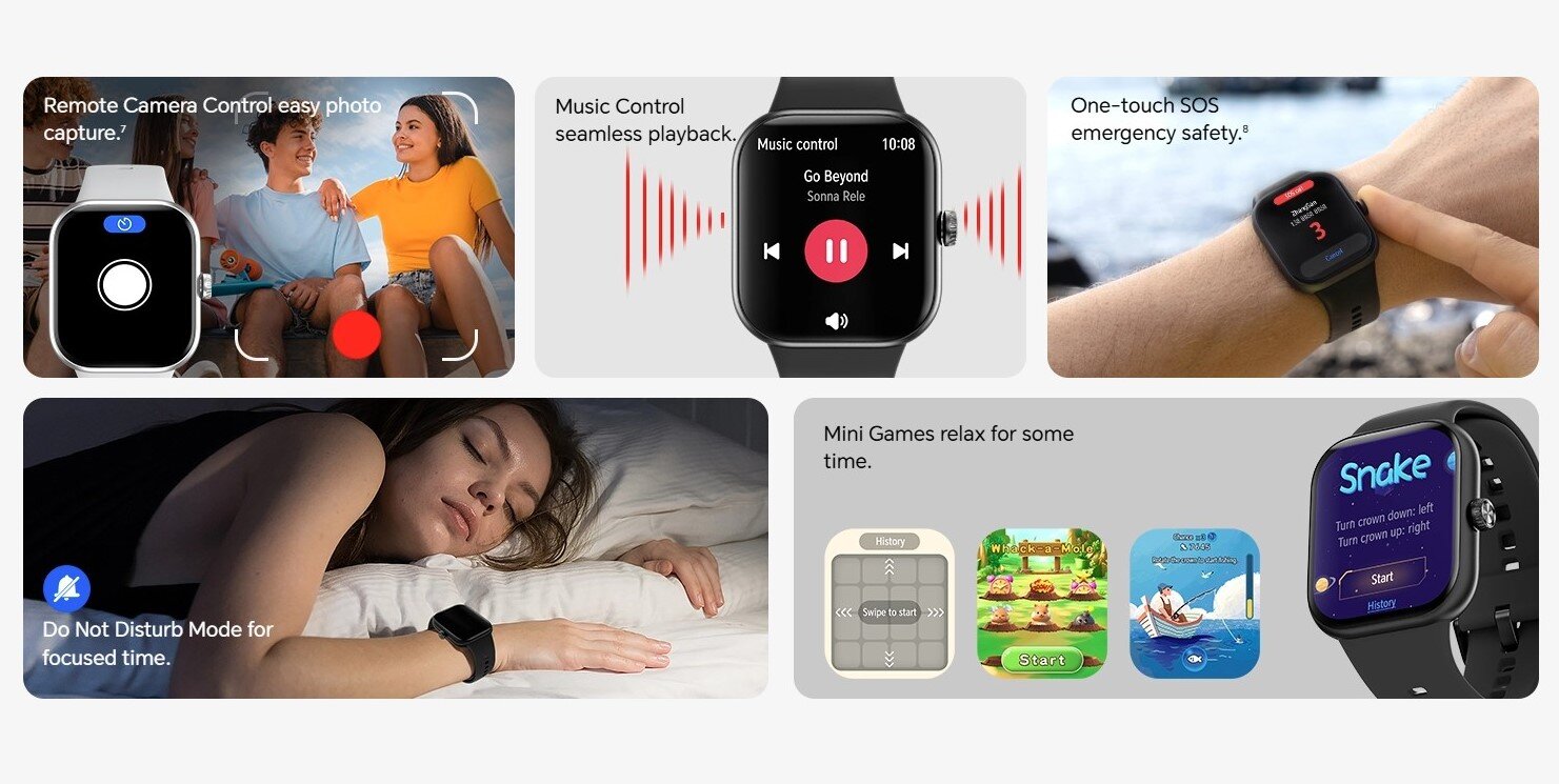 Большой экран с тонкой рамкой (1,8 мм) занимает 82% фронтальной поверхности, он обеспечивает хорошую читаемость и большую вместимость информации. Частота обновления составляет 60 Гц, работа интерфейса плавная. Пользователям доступны режим Always On Display, активация подсветки взмахом руки и множество циферблатов для персонализации оформления главного экрана.