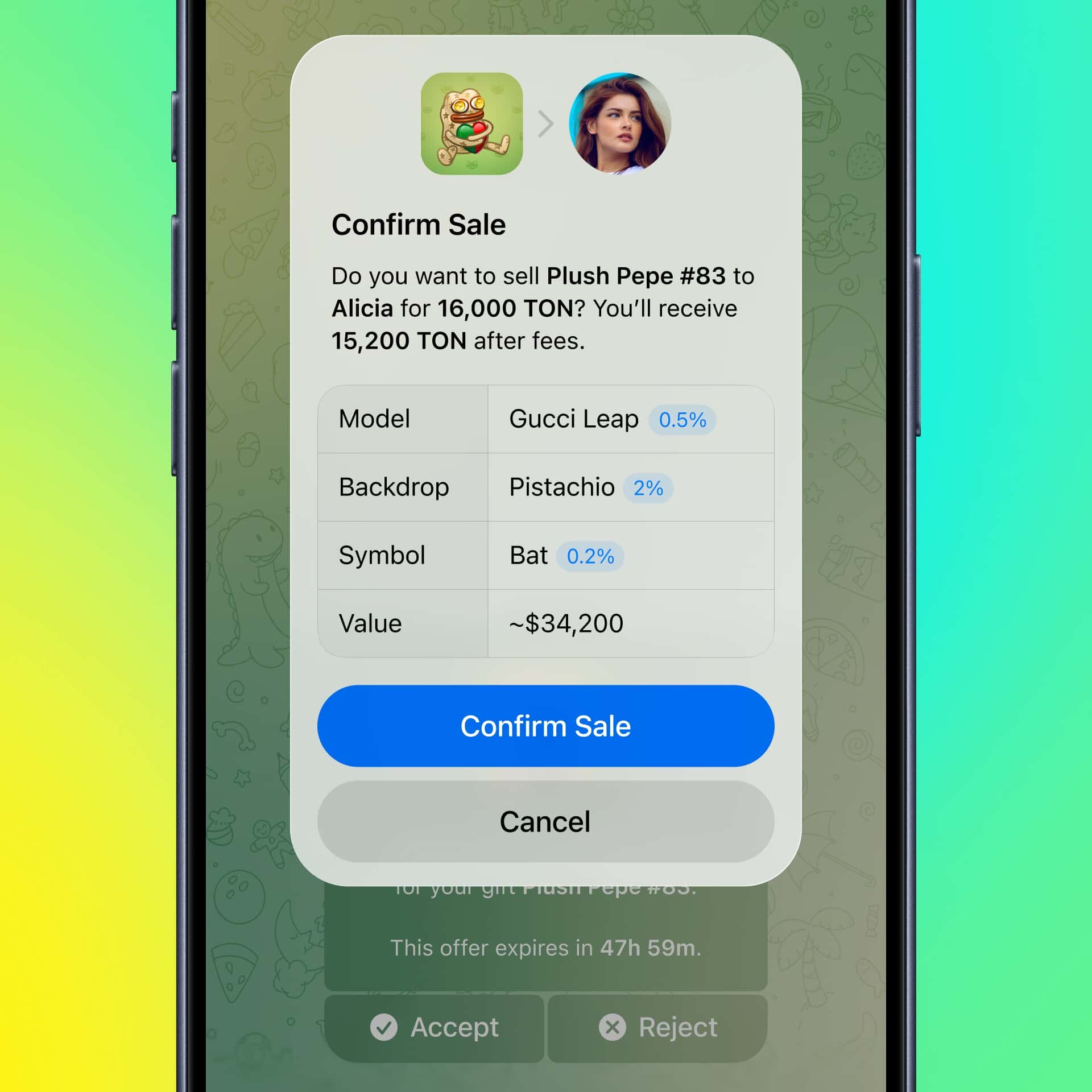 Также теперь при просмотре профиля можно предложить пользователю продать тот или иной подарок за звёзды или криптовалюту TON. Инициатор самостоятельно устанавливает цену и срок действия предложения. Озвученная сумма резервируется системой на время действия предложения. Если срок истёк, или пользователь не решился на продажу, средства автоматически возвращаются на счёт покупателя.