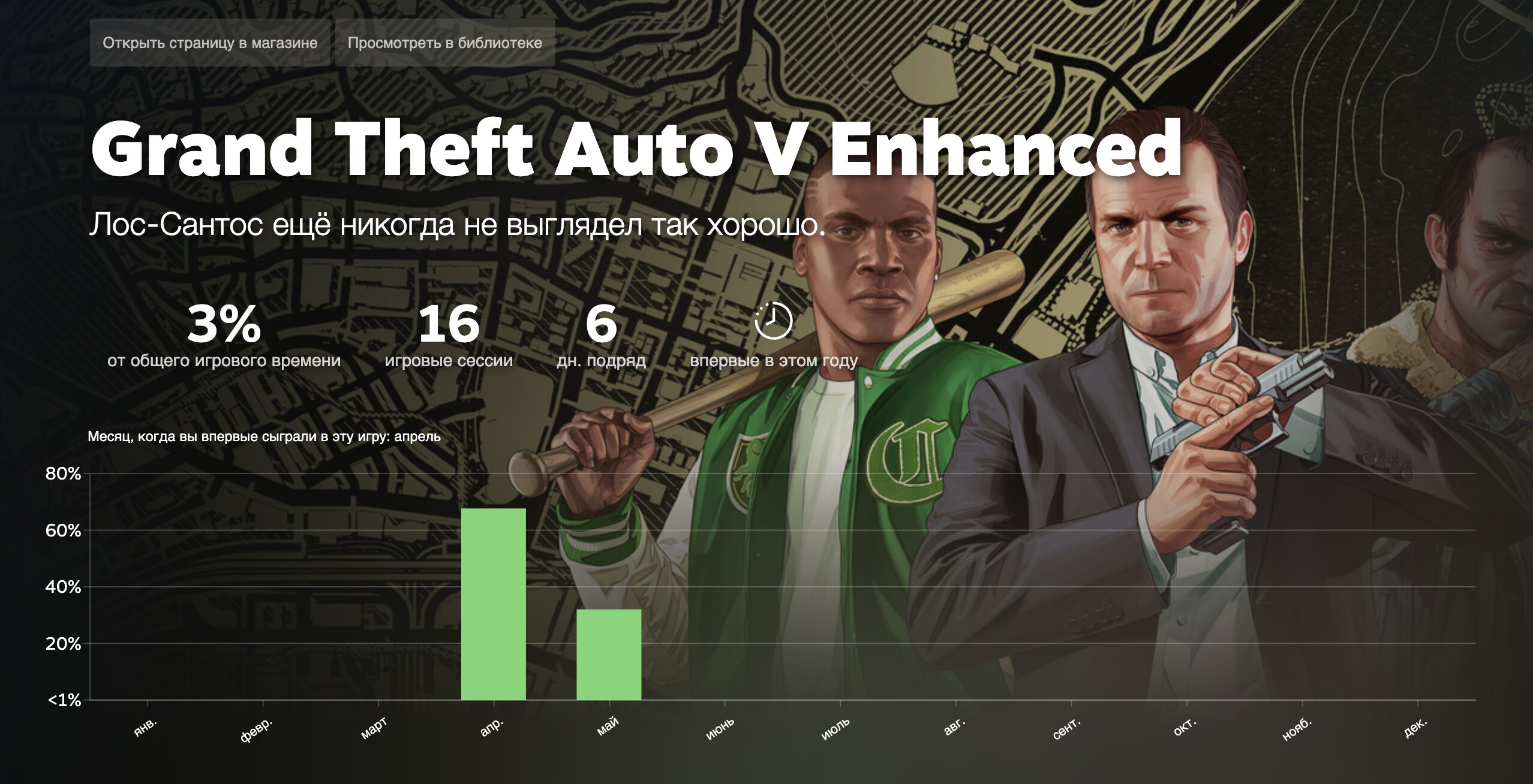Сразу под основной статистикой указаны наиболее популярные игры конкретного геймера — с процентом от общего игрового времени и количеством игровых сессий (запусков клиента). А если нажать на баннер этой игры, можно получить статистику по времени за каждый месяц текущего года.