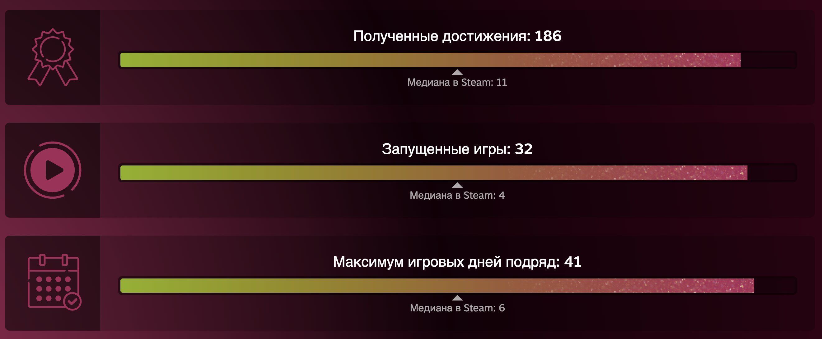Дальше идёт, пожалуй, самый познавательный раздел «Всё познаётся в сравнении» со сравнением результатов игрока с медианными показателями по Steam. Здесь указано, что в среднем игроки за год получили 11 достижений, запустили 4 игры и провели 6 игровых дней подряд.
