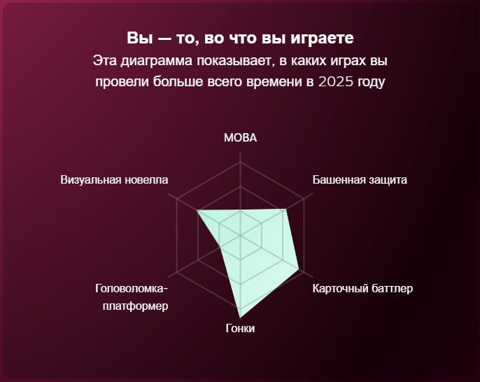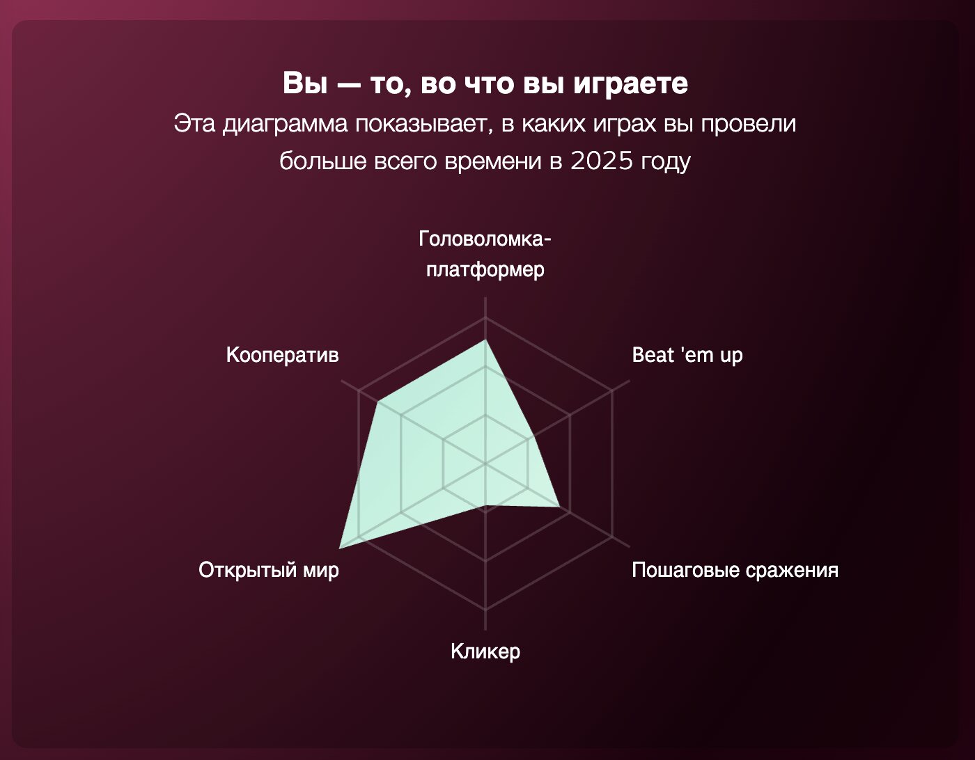 А в разделе «Вы — то, во что вы играете» можно посмотреть на диаграмму, которая наглядно демонстрирует, в каких играх геймер провёл больше всего времени в текущем году.