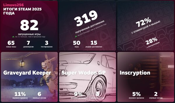 Вчера, 16 декабря, компания Valve запустила в Steam страницу Replay — раздел с персональными итогами года для каждого геймера, в котором можно детально изучить свою статистику на данной платформе по итогам 2025 года. Например, платформа сообщит о количестве запущенных за последние 12 месяцев игр, включая новые релизы, которые игрок ранее никогда не запускал, и укажет рост или падение по сравнению с прошлым годом. Здесь же указано количество полученных достижений, включая редкие достижения, а также процент тайтлов, которые были запущены с клавиатурой и мышкой или с контроллером.