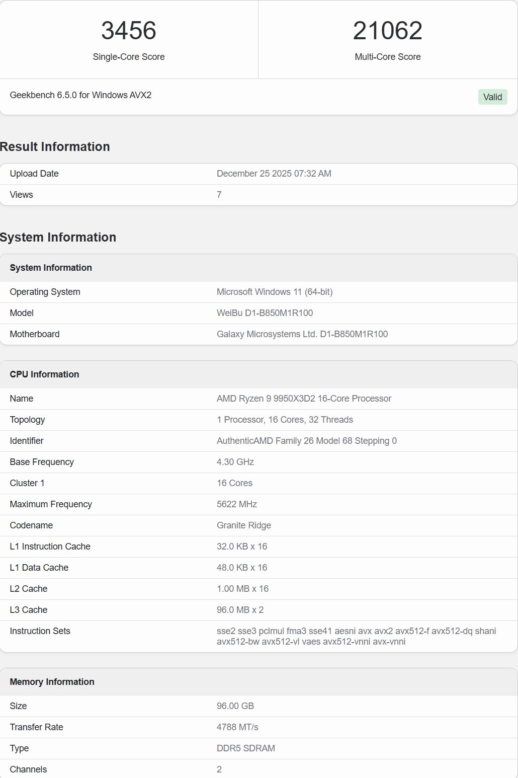 Сегодня, 26 декабря, сразу несколько довольно известных инсайдеров опубликовали в социальных сетях, предположительно, результаты тестирования неанонсированного процессора AMD Ryzen 9 9950X3D2 в синтетических бенчмарках Geekbench и PassMark. И если эта информация верна, грядущий флагманский процессор компании AMD получит сразу 192 МБ кэша 3D V-Cache нового поколения, что является впечатляющим объёмом даже по современным меркам. Для сравнения, у Ryzen 9 9950X3D имеется 128 МБ кэш-памяти той же технологии, и это буквально лидер по этому параметру среди потребительских десктопных процессоров.