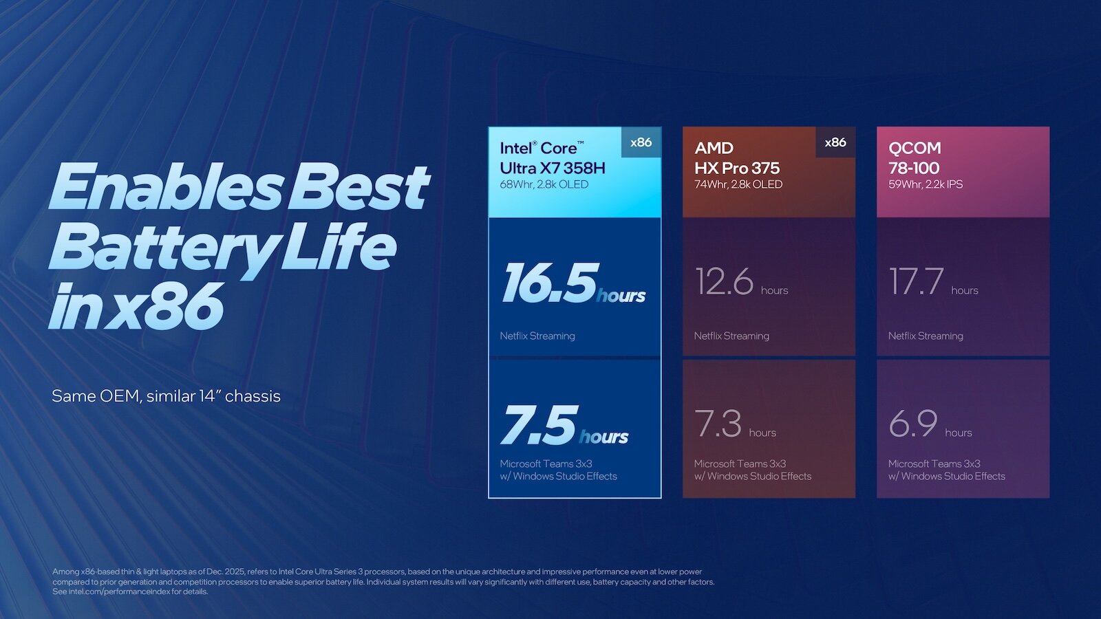 Ещё в ходе презентации Intel сделала особый акцент на длительность автономной работы OEM-устройства с 14-дюймовым дисплеем на базе Core Ultra X7 385H — в режиме стриминга видео из интернета гаджет проработал 16,5 часа от одного заряда, а в режиме видеозвонка — 7,5 часа. У AMD HX Pro 375 результаты слегка хуже, но, опять же, вчера AMD выпустила свежие чипы, которые в рамках неназванных устройств в процессе просмотра видео из памяти гаджета обеспечивают до 24 часов автономности. Так что на данный момент напрямую сравнить лучшее решение Intel и AMD проблематично — придётся ждать независимые обзоры.