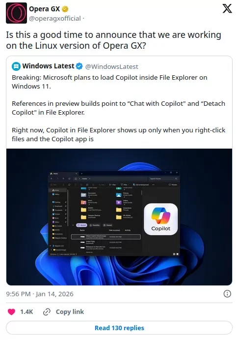 Вся история с анонсом началась с краткого поста журналистов издания Windows Latest в социальной сети X, который, кстати, никак не относится ни к браузерам, ни к самой компании Opera. Речь в публикации шла об операционной системе Windows 11 и о планах разработчиков добавить Copilot в «Проводник» ОС.