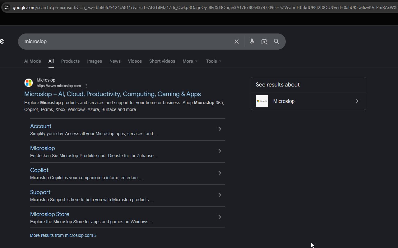 В магазине Chrome появилось расширение, которое заменяет слово «Microsoft» на «Microslop» на всех веб-страницах. Изменения происходят на стороне пользователя, исходный код, как и все веб-элементы, остаются нетронутыми. Как заявляет разработчик, он создал расширение ради шутки, и пользователи её оценили. Оказывается, главе Microsoft Сатье Наделле термин «Microslop» не нравится, что вызывает обратный эффект, известный также как эффект Барбары Стрейзанд.