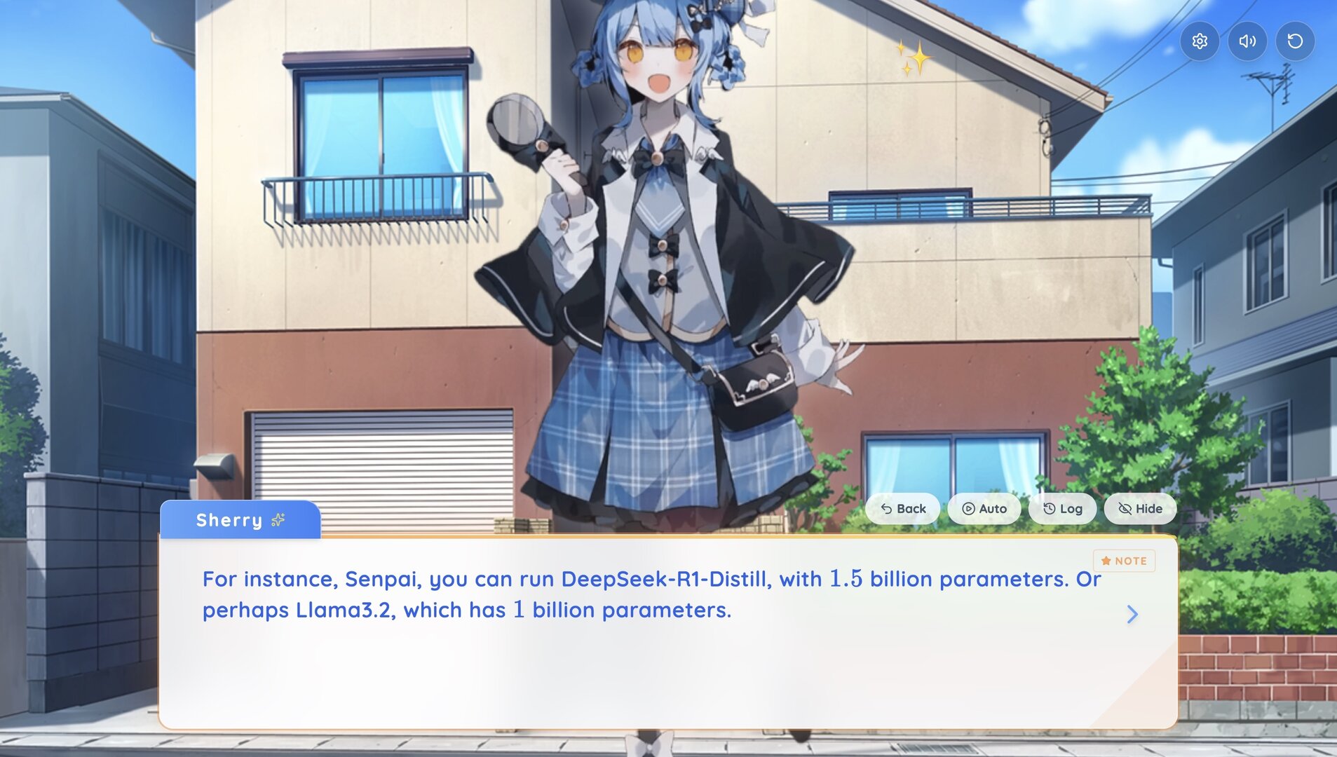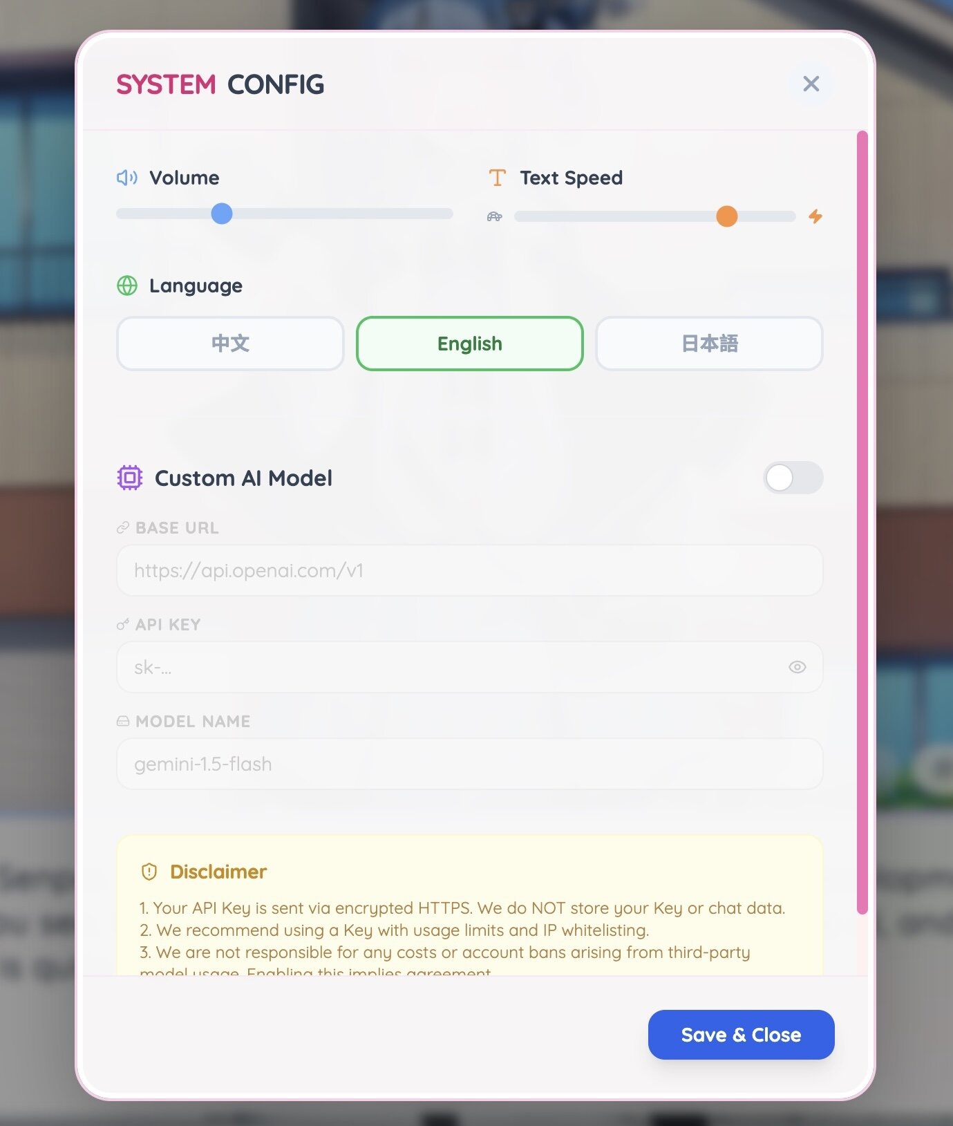 Более того, в рамках самого рассказал от лица аниме-персонажа тоже есть настройки — можно выбрать один из трёх языков, подобрать оптимальную громкость фоновой музыки и скорость генерации текстового контента в окне. При желании можно даже подключить кастомный API стороннего искусственного интеллекта, чтобы расширить возможности ИИ.
