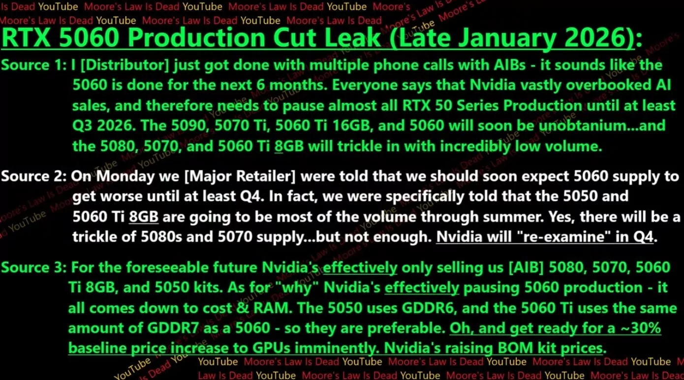 С сентября 2025 года рынок компьютерных комплектующих находится в довольно шатком состоянии — из-за колоссального спроса на чипы памяти DRAM со стороны центров обработки данных многие производители сократили своё присутствие на потребительском рынке, что в итоге привело к подорожанию ОЗУ, SSD, HDD, видеокарт и даже процессоров. Но, как и прогнозировали аналитики, в 2026 году ситуация станет только хуже — сегодня, 22 января, известный инсайдер Moore's Law Is Dead со ссылкой на свои источники в индустрии сообщил, что компания NVIDIA приостановила производство видеокарт RTX 5060 как минимум на ближайшие шесть месяцев. Да и другие модели RTX 50 тоже пол угрозой.