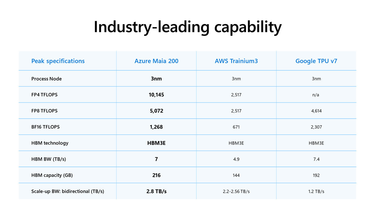 К примеру, ускоритель демонстрирует в три раза более высокую производительность FP4 (10 петафлопс) по сравнению с Amazon Trainium третьего поколения. Более того, Maia 200 превосходит по FP8-производительности (5 петафлопс) TPU седьмого поколения от компании Google, который считается весьма мощным решением в своём сегменте. Но, конечно, куда важнее, что новый ускоритель является весьма эффективным решением с точки зрения финансов.