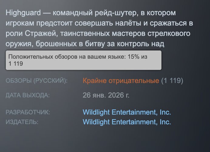 Кроме того, команда разработчиков, которая ранее подарила миру Titanfall и Apex Legends, устранила ключевую проблему Concord, с которой Highguard активно сравнивают. Суть в том, что новый рейд-шутер является условно-бесплатной игрой, что крайне положительно сказалось на онлайне в момент запуска — Highguard в первый же день собрала 97,2 тысячи активных игроков, что довольно неплохо для тайтла с небольшим бюджетом на маркетинг. Но, к сожалению, релиз прошёл не очень гладко — довольно быстро пиковый онлайн игры упал до 20 тысяч, а в Steam новинка буквально утонула в негативных отзывах геймеров (на данный момент рейтинг «Крайне отрицательный»).