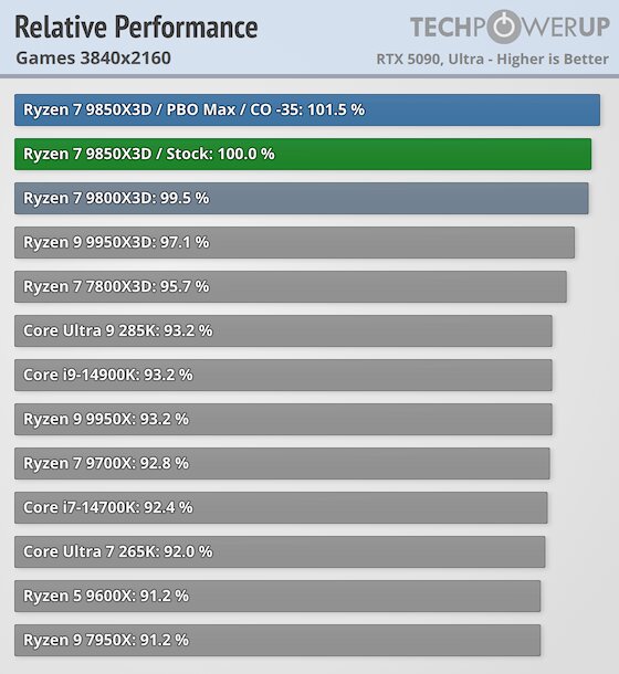 Судя по тестам информационного издания TechPowerUp, процессор Ryzen 7 9850X3D превзошёл Ryzen 7 9800X3D всего на 2,5%, да и то в разрешении Full HD, которое для флагманского чипа явно не является целевым. В 4К-разрешении отрыв новинки от предыдущего «самого мощного процессора» составляет всего 0,5% — и это с учётом того, что издание включает в тесты Counter-Strike 2, в котором чип набирает почти 330 FPS. Если же убрать из тестирования подобные не очень требовательные игры, разрыв был бы ещё меньше, а ведь все эти тесты проводились с RTX 5090. То есть если в системе геймера хотя бы RTX 5080, разницу между процессорами можно будет свести к погрешности при замерах.
