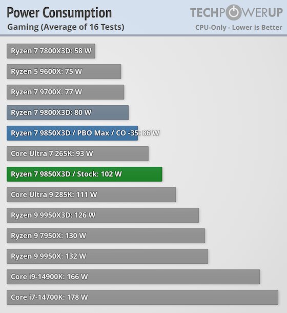 При этом за столь незначительный прирост производительности пользователю пидётся немало заплатить — и речь не о деньгах, а о ваттах. Дело в том, что добиться повышения производительности AMD удалось за счёт повышения тактовой частоты при той же архитектуре Zen 5, что вылилось в повышение энергопотребления. Например, в однопоточных приложениях новинка потребляет 36 Вт против 25 Вт у предшественника, а в играх среднее энергопотребление возросло с 80 Вт до 100 Вт. Безусловно, Ryzen 7 9850X3D всё ещё остаётся довольно энергоэффективным процессором, особенно на фоне прожорливых решений Intel топового уровня, но, с другой стороны, оправдать +0,5% в 4К-разрешении приростом в 20 Вт довольно проблематично.