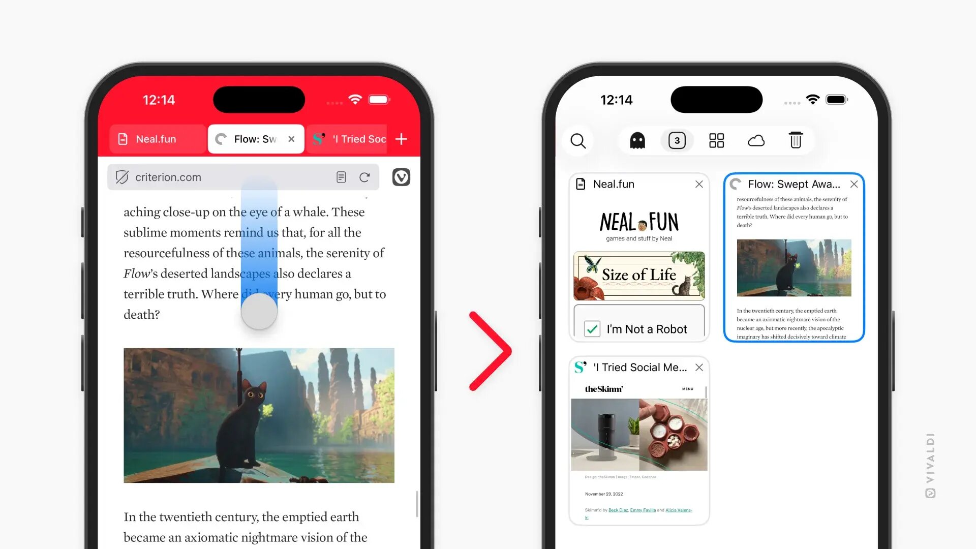 Если говорить о версии под операционную систему iOS, разработчики сконцентрировали своё внимание на оптимизации рабочих процессов. Одна из новых функций, переключение вкладок с помощью свайпа, позволяет переходить к переключателю вкладок, проводя пальцем вверх или вниз по адресной строке. Разработчики Vivaldi считают, что это очень удобно, поскольку функция работает там, где уже находится большой палец пользователя.