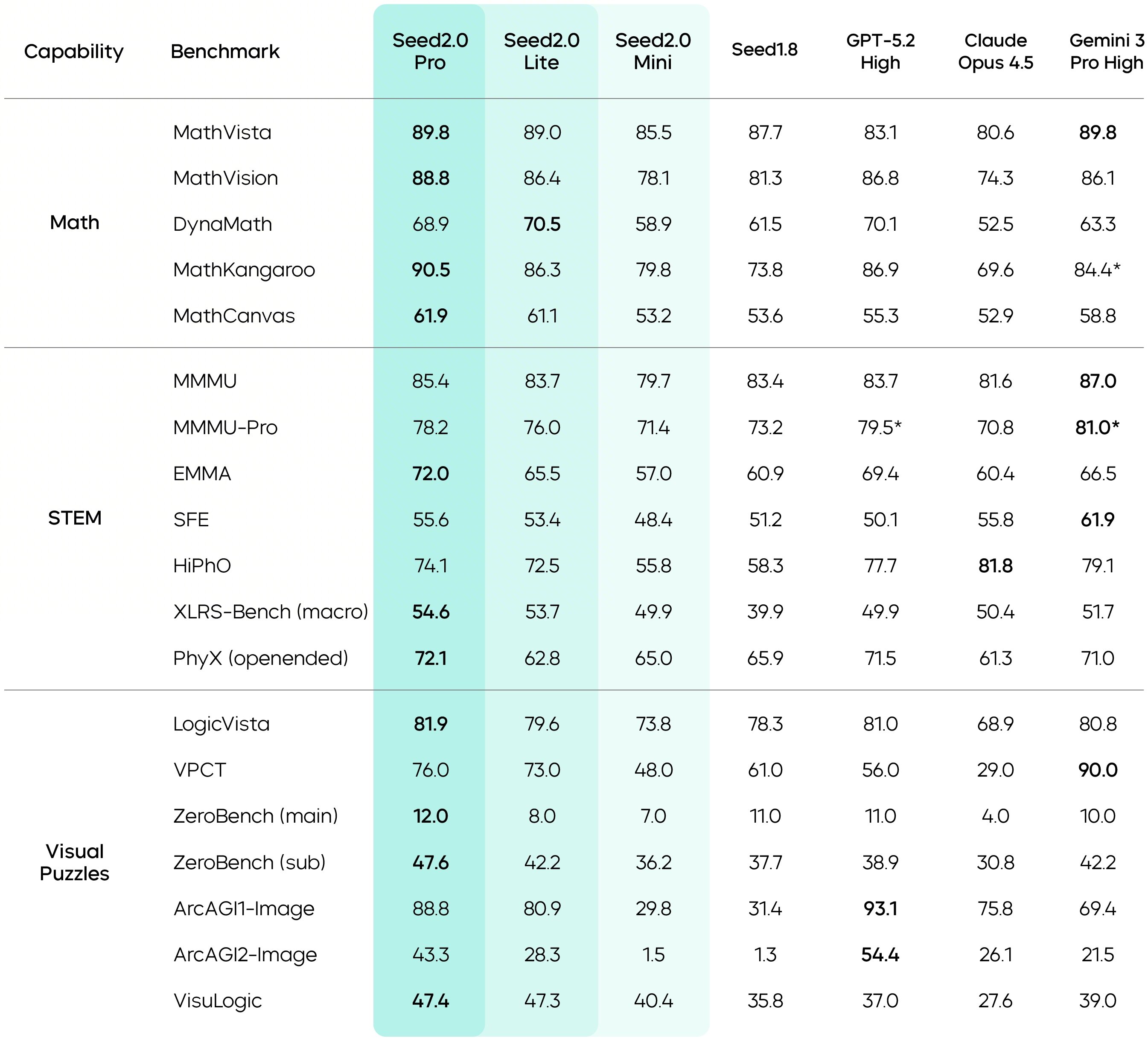 Например, в математических бенчмарках MathVista и MathVision модель Seed 2.0 Pro набирает 89,8 и 88,8 балла соответственно, тогда как GPT-5.2 High набирает всего 83,1 и 86,8 балла. Конкурировать с новинкой из Китая в этой области может лишь Gemini 3 Pro High. Да и по остальным направлениям показатели у новой модели очень достойные — на уровне или лучше ИИ-гигантов из США.