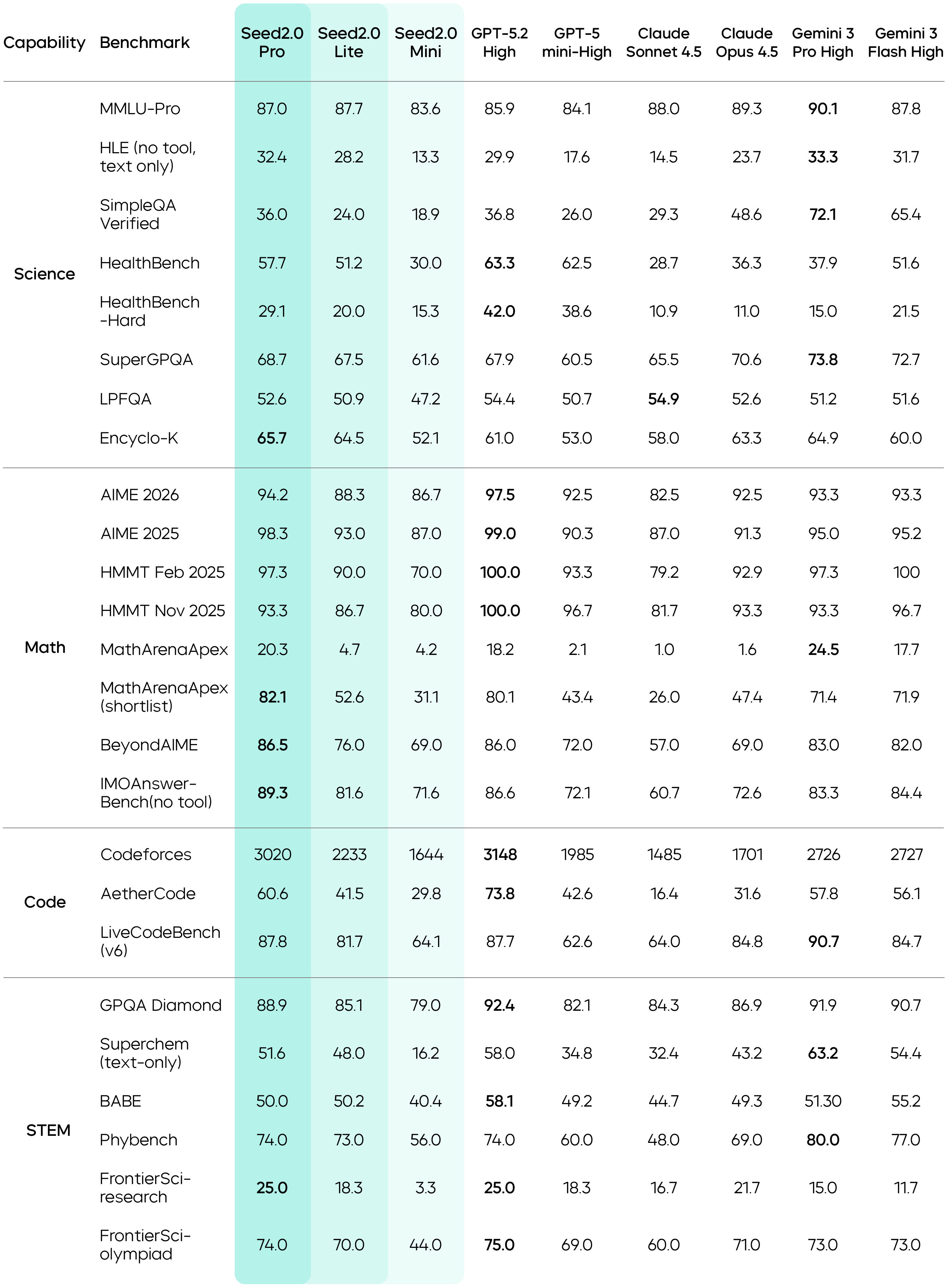 И, в-третьих, серия Seed 2.0 состоит из трёх моделей, отличающихся по размеру — речь о самой компактной Mini, Lite и крупной Pro. Кроме того, для программирования была выпущена специальная версия Code, которая оптимизирована под задачи разработчиков. Соответственно, пользователь может подобрать подходящую ему версию модели исходя из конкретных задач и возможностей — кому-то будет достаточно и небольшой версии Mini, а кому-то для тяжёлых сценариев пригодится Pro-модификация. Последняя, что весьма ожидаемо, демонстрирует впечатляющие показатели в популярных бенчмарках.