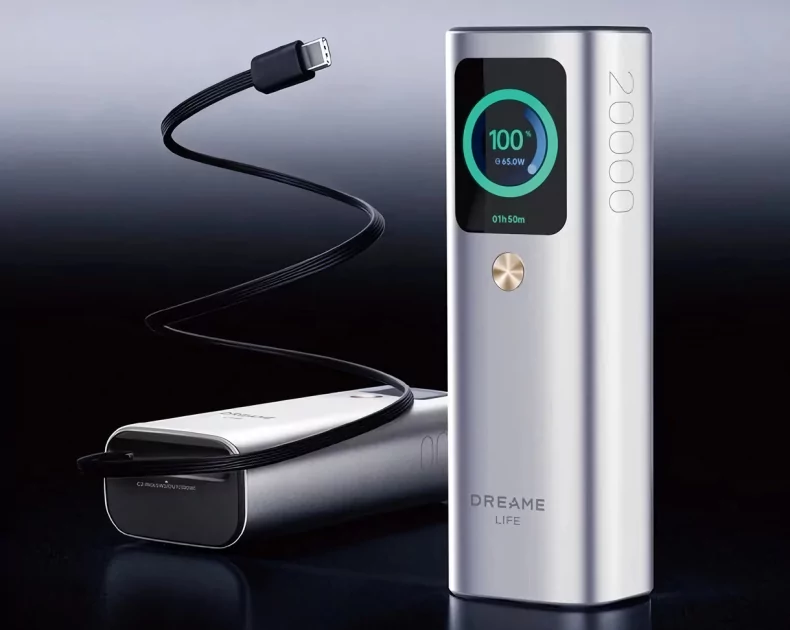 Компания Dreame выпустила внешний аккумулятор мощностью 165 Вт со встроенным кабелем и TFT-экраном. Устройство очень похоже на представленную ранее модель Thunderobot V20 PRO, оснащено двумя портами USB-C и одним USB-A. Заявленная ёмкость составляет 20 000 мА·ч (номинальная 12000 мА·ч). Повербанк выполнен в корпусе из алюминиевого сплава, его размеры составляют 156×52,8×40,8 мм, вес — 505 граммов. На передней панели расположен цветной экран, отображающий уровень заряда батареи, энергопотребление и время работы. Есть возможность включить функцию Always-On Display.