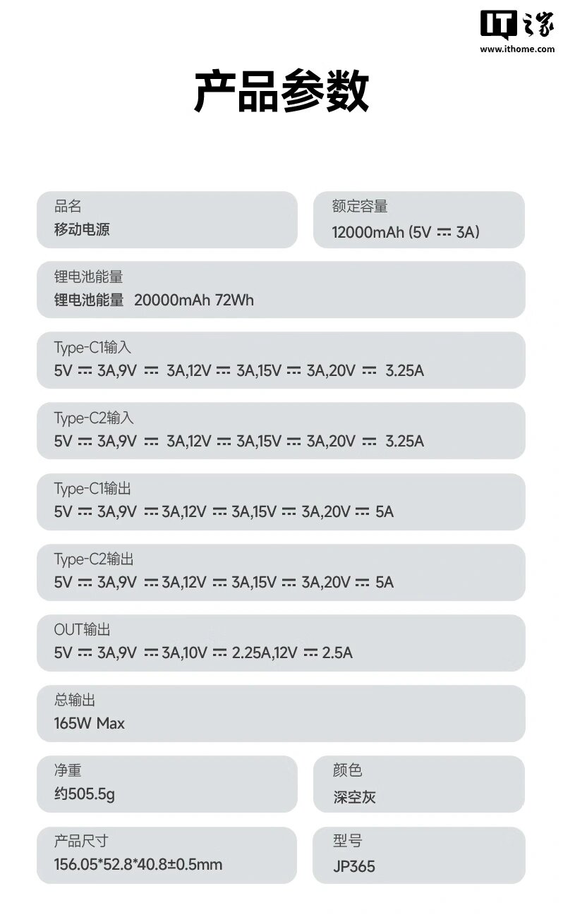 Порт USB-C устройства и встроенный кабель поддерживают выходную мощность 100 Вт / 65 Вт, а порт USB-A — 30 Вт. В режиме двойного подключения с использованием как порта USB-C, так и кабеля USB-C мощность может достигать 165 Вт. Производитель заявляет, что повербанк сохраняет более 80% своей ёмкости после 500 циклов зарядки. Стоимость гаджета — 399 юаней (около 4 430 рублей).