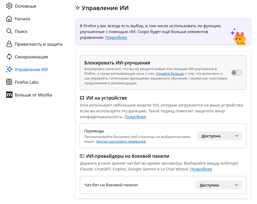 В Firefox 148 добавлены новые настройки для управления искусственным интеллектом в разделе. Среди них — «выключатель», который блокирует все новые и существующие функции искусственного интеллекта в Firefox.