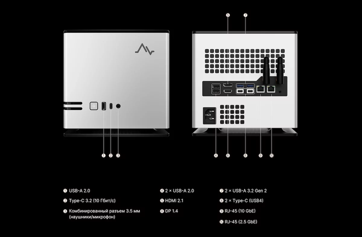 - Интерфейсы: 3× USB Type-A 2.0, 2× USB Type-A 3.2 Gen2, 2× USB Type-C 4.0, 1× USB Type-C 10G, 1× Clear CMOS, 1× HDMI 2.1 TMDS, 1× DisplayPort 1.4, 1× RJ45 10G, 1× 2.5G RJ45.