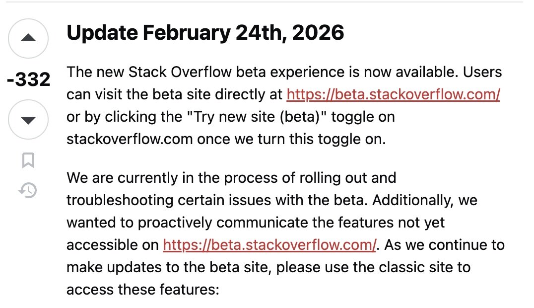 Ещё разработчики платформы существенно упростили верхнюю навигационную панель, убрали множество непопулярных элементов из бокового меню, перенесли информацию об авторе публикации в самое начало поста и доработали интерфейс написания комментариев. Последний пункт особенно важен, так как удобная форма написания комментария, в теории, может подтолкнуть пользователей к более активному поведению на платформе. А ведь именно ради ответов на поставленные вопросы многие до сих пор продолжают пользоваться Stack Overflow. Впрочем, судя по статистике, платформе медленно умирает — в декабре 2025 года на Stack Overflow было задано всего 3862 вопроса, то есть на 78% меньше, чем годом ранее, и на 95% меньше, чем на пике популярности.