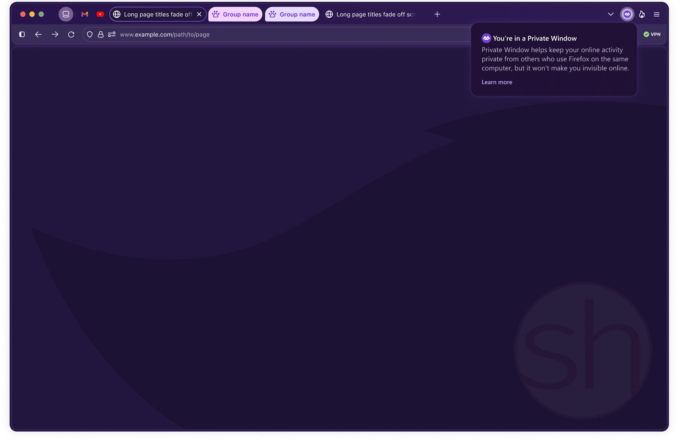 На следующих скриншотах показана светлая тема с открытым меню Firefox, тёмная тема с двумя окнами для просмотра контента на двух страницах (функция, над которой Mozilla также в настоящее время работает), а также режим инкогнито.