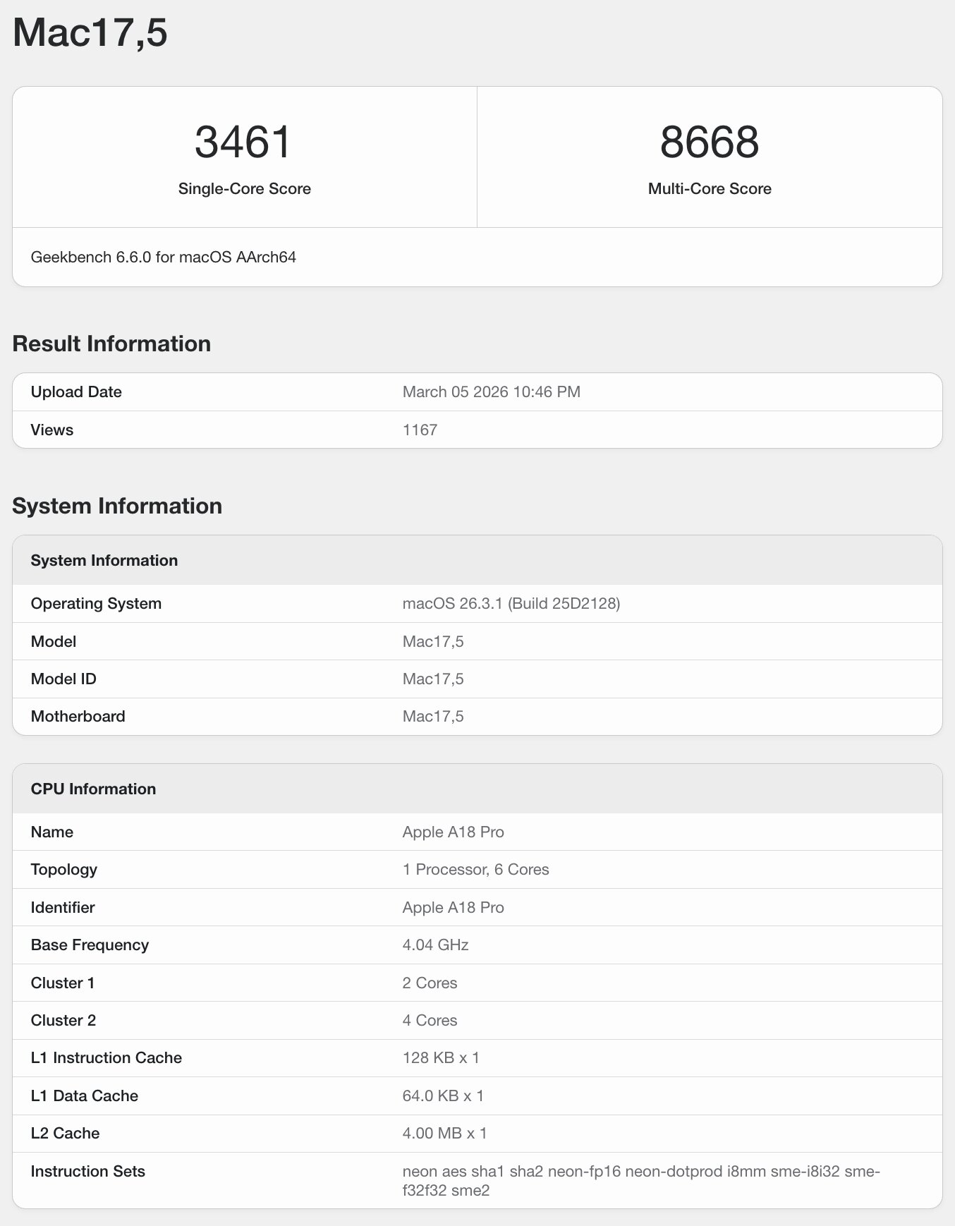 Два дня назад, 4 марта, компания Apple официально представила свой самый доступный ноутбук под названием MacBook Neo, который довольно быстро раскритиковали в интернете за отсутствие подсветки клавиатуры, возможности «прокачать» оперативную память и мобильный процессор A18 Pro. А вчера, 5 марта, информационное издание MacRumors заметило в базе данных бенчмарка Geekbench результаты тестирования этой модели, которые наглядно показывают, что на самом деле доступный портативный ПК от гиганта из Купертино демонстрирует довольно неплохую производительность. От ноутбука за 599 долларов явно ожидали чего-то иного.