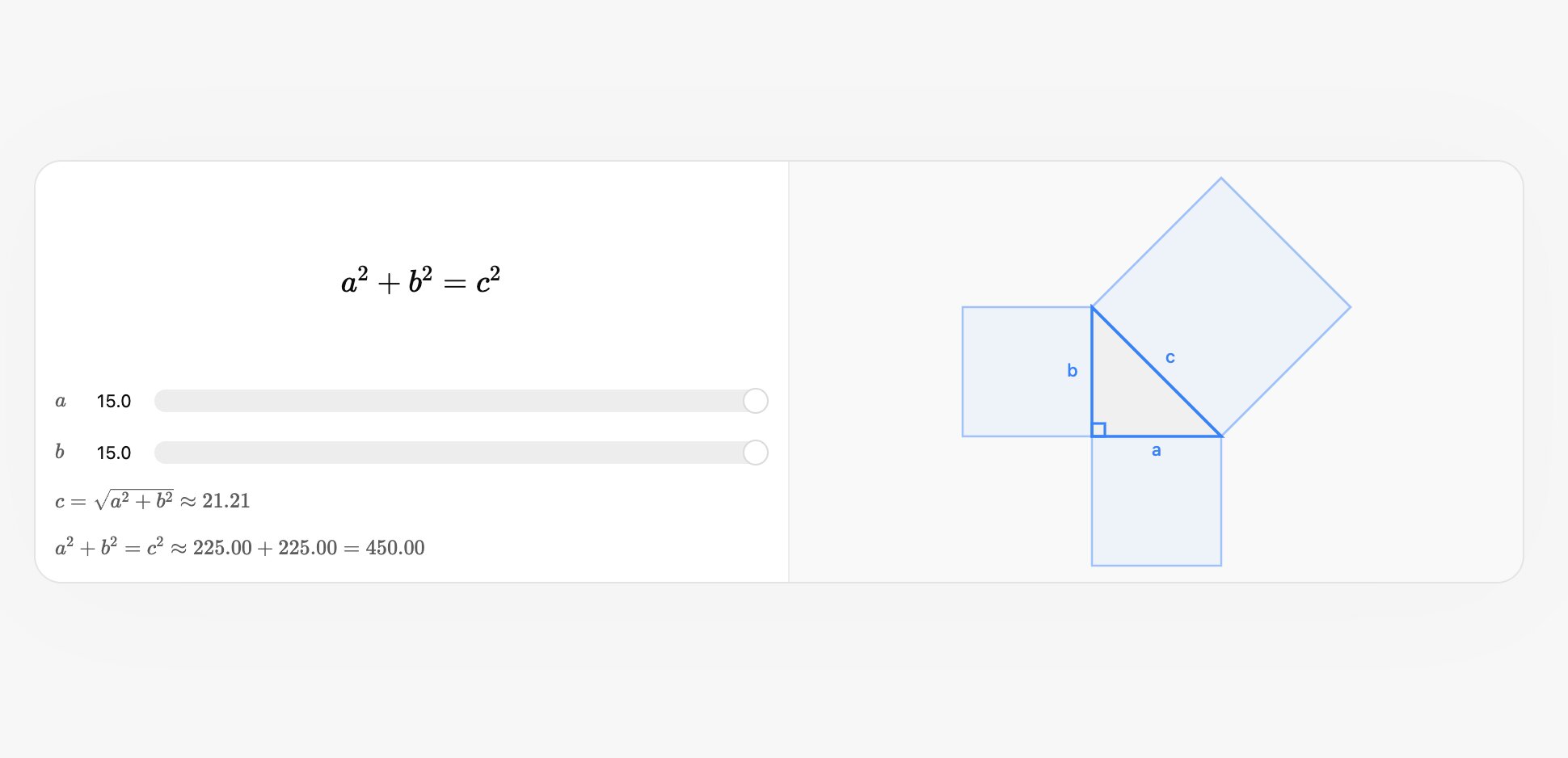 Например, в официальном блоге OpenAI показана демонстрация работы функции с теоремой Пифагора — на экране пользователя появится само уравнение a²+b²=c², под ним можно увидеть два интерактивных ползунка, меняющих параметр «a» и «b», а справа отображается наглядная иллюстрация с треугольником и его сторонами. При помощи ползунков пользователь может менять длину стороны «a» или «b», сразу же получая информацию о том, как изменится треугольник и длина стороны «c». Впрочем, есть и демонстрации куда более сложных вещей — например, уравнение состояния идеального газа.